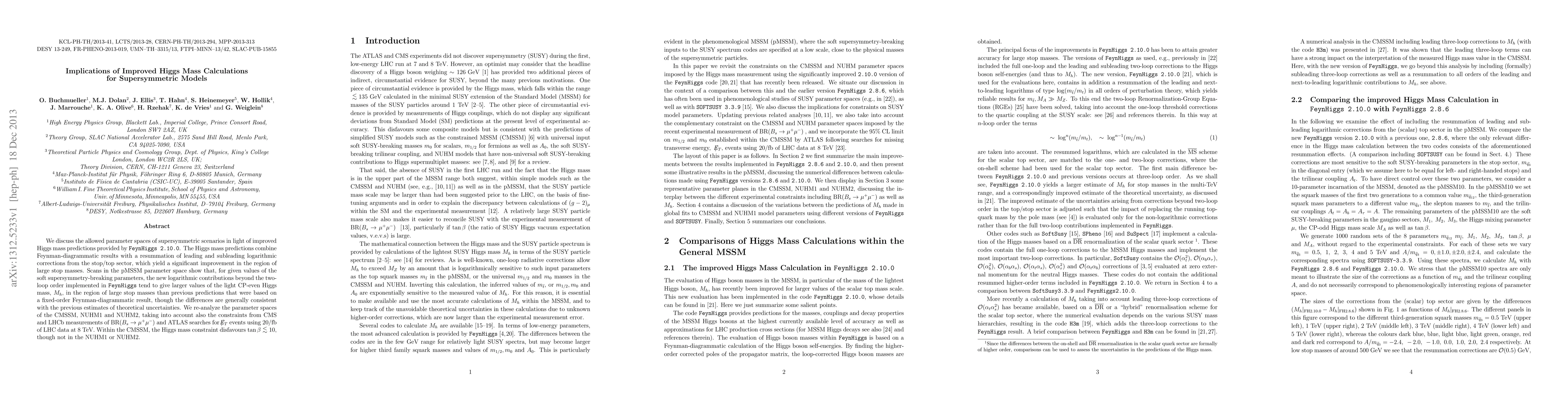 We discuss the allowed parameter spaces of supersymmetric scenarios in light of improved Higgs mass predictions provided by FeynHiggs 2.10.0. The Higgs mass predictions combine Feynman-diagrammatic results with a resummation of leading and subleading logarithmic corrections from the stop/top sector, which yield a significant improvement in the region of large stop masses. Scans in the pMSSM parameter space show that, for given values of the soft supersymmetry-breaking parameters, the new logarithmic contributions beyond the two-loop order implemented in FeynHiggs tend to give larger values of the light CP-even Higgs mass, M_h, in the region of large stop masses than previous predictions that were based on a fixed-order Feynman-diagrammatic result, though the differences are generally consistent with the previous estimates of theoretical uncertainties. We re-analyze the parameter spaces of the CMSSM, NUHM1 and NUHM2, taking into account also the constraints from CMS and LHCb measurements of B_s to \mu+\mu- and ATLAS searches for MET events using 20/fb of LHC data at 8 TeV. Within the CMSSM, the Higgs mass constraint disfavours tan beta lesssim 10, though not in the NUHM1 or NUHM2.