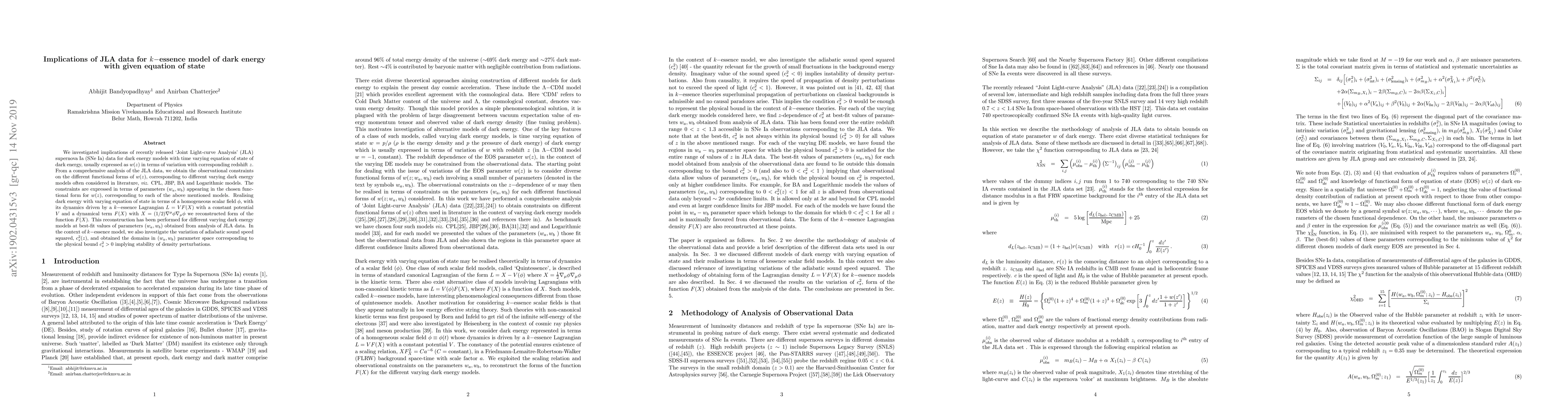 The research analyzes the Joint Light-curve Analysis (JLA) supernova data to constrain dark energy models with variable equation of state (w(z)). It reconstructs the k-essence Lagrangian form F(X) for different models and investigates the stability of density perturbations by examining the adiabatic sound speed squared, c_s^2(z), ensuring it remains positive for physical stability.