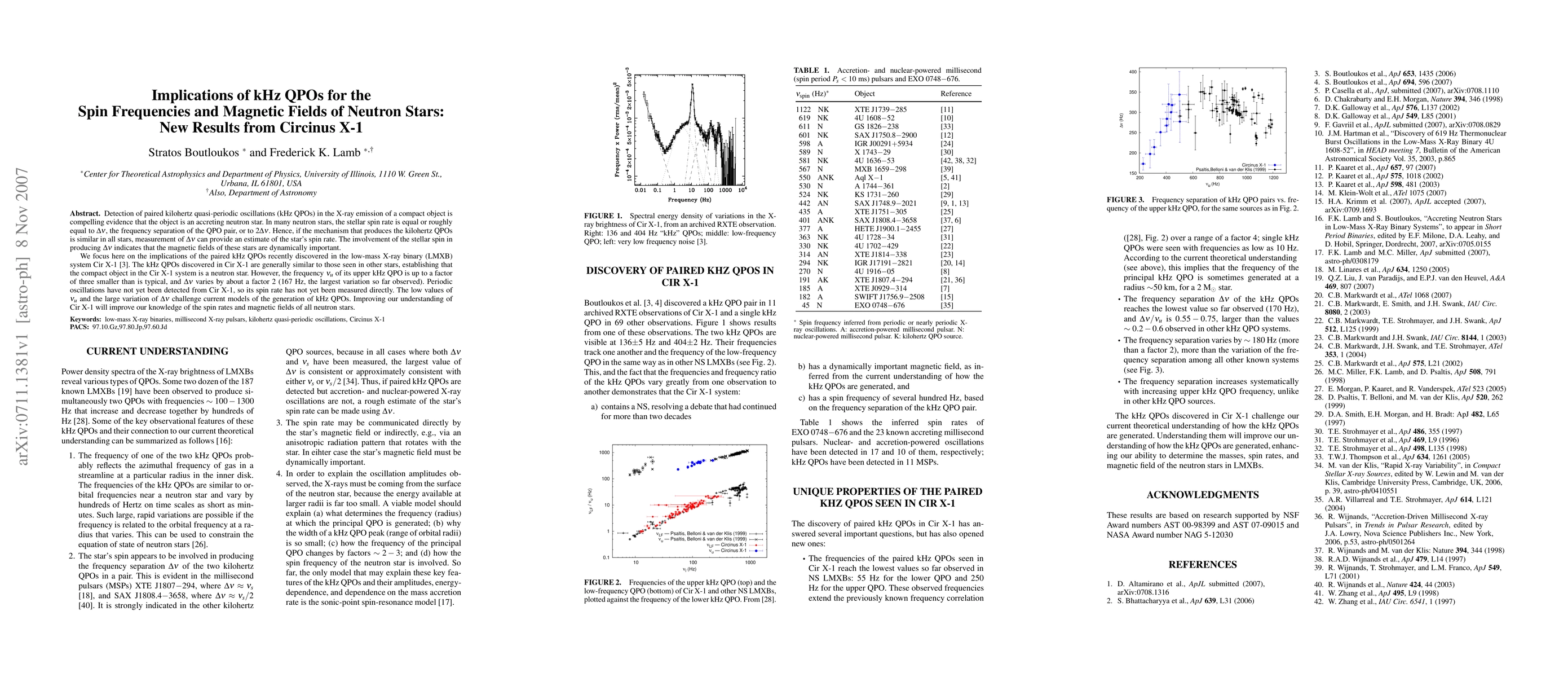Detection of paired kilohertz quasi-periodic oscillations (kHz QPOs) in the X-ray emission of a compact object is compelling evidence that the object is an accreting neutron star. In many neutron stars, the stellar spin rate is equal or roughly equal to Delta-nu, the frequency separation of the QPO pair, or to 2Delta-nu. Hence, if the mechanism that produces the kilohertz QPOs is similar in all stars, measurement of Delta-nu can provide an estimate of the star's spin rate. The involvement of the stellar spin in producing Delta-nu indicates that the magnetic fields of these stars are dynamically important. We focus here on the implications of the paired kHz QPOs recently discovered in the low-mass X-ray binary (LMXB) system Cir X-1 (Boutloukos et al. 2006). The kHz QPOs discovered in Cir X-1 are generally similar to those seen in other stars, establishing that the compact object in the Cir X-1 system is a neutron star. However, the frequency nu-u of its upper kHz QPO is up to a factor of three smaller than is typical, and Delta-nu varies by about a factor 2 (167 Hz, the largest variation so far observed). Periodic oscillations have not yet been detected from Cir X-1, so its spin rate has not yet been measured directly. The low values of nu-u and the large variation of Delta-nu challenge current models of the generation of kHz QPOs. Improving our understanding of Cir X-1 will improve our knowledge of the spin rates and magnetic fields of all neutron stars.