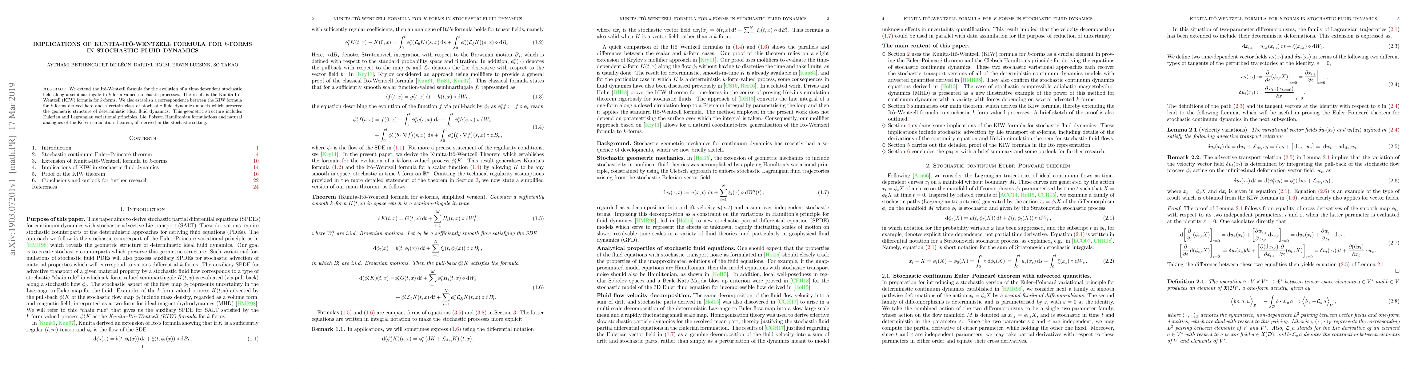 We extend the It\^o-Wentzell formula for the evolution of a time-dependent stochastic field along a semimartingale to $k$-form-valued stochastic processes. The result is the Kunita-It\^o-Wentzell (KIW) formula for $k$-forms. We also establish a correspondence between the KIW formula for $k$-forms derived here and a certain class of stochastic fluid dynamics models which preserve the geometric structure of deterministic ideal fluid dynamics. This geometric structure includes Eulerian and Lagrangian variational principles, Lie--Poisson Hamiltonian formulations and natural analogues of the Kelvin circulation theorem, all derived in the stochastic setting.