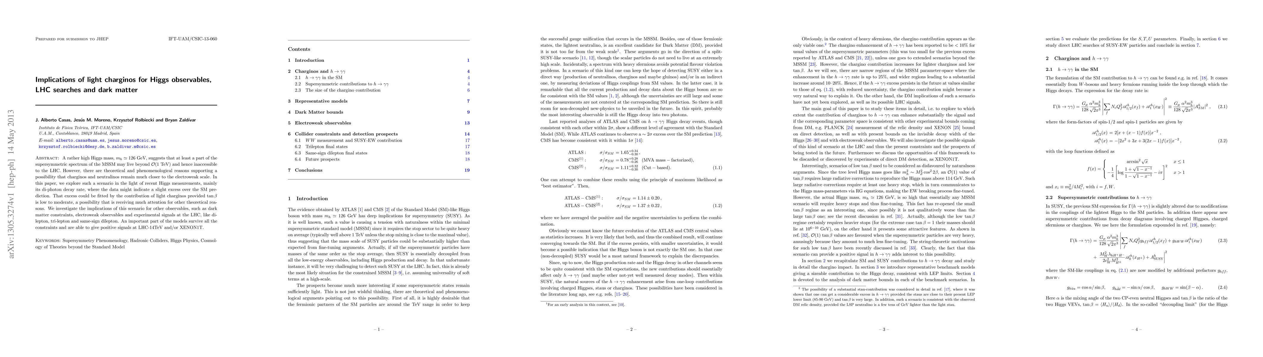 A rather high Higgs mass, m_h = 126 GeV, suggests that at least a part of the supersymmetric spectrum of the MSSM may live beyond O(1TeV) and hence inaccessible to the LHC. However, there are theoretical and phenomenological reasons supporting a possibility that charginos and neutralinos remain much closer to the electroweak scale. In this paper, we explore such a scenario in the light of recent Higgs measurements, mainly its di-photon decay rate, where the data might indicate a slight excess over the SM prediction. That excess could be fitted by the contribution of light charginos provided tan(beta) is low to moderate, a possibility that is receiving much attention for other theoretical reasons. We investigate the implications of this scenario for other observables, such as dark matter constraints, electroweak observables and experimental signals at the LHC, like di-lepton, tri-lepton and same-sign dilepton. An important part of the models survive all the constraints and are able to give positive signals at LHC-14TeV and/or XENON1T.