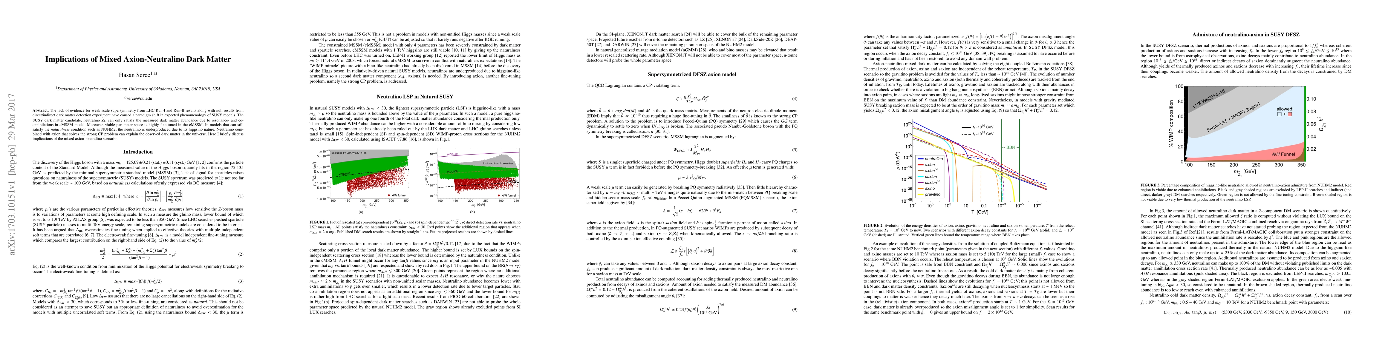 The lack of evidence for weak scale supersymmetry from LHC Run-I and Run-II results along with null results from direct/indirect dark matter detection experiment have caused a paradigm shift in expected phenomenology of SUSY models. The SUSY dark matter candidate, neutralino $\widetilde{Z}_1$, can only satisfy the measured dark matter abundance due to resonance- and co-annihilations in cMSSM model. Moreover, viable parameter space is highly fine-tuned in the cMSSM. In models that can still satisfy the naturalness condition such as NUHM2, the neutralino is underproduced due to its higgsino nature. Neutralino combined with axion that solves the strong CP problem can explain the observed dark matter in the universe. Here I briefly discuss implications of the mixed axion-neutralino scenario.