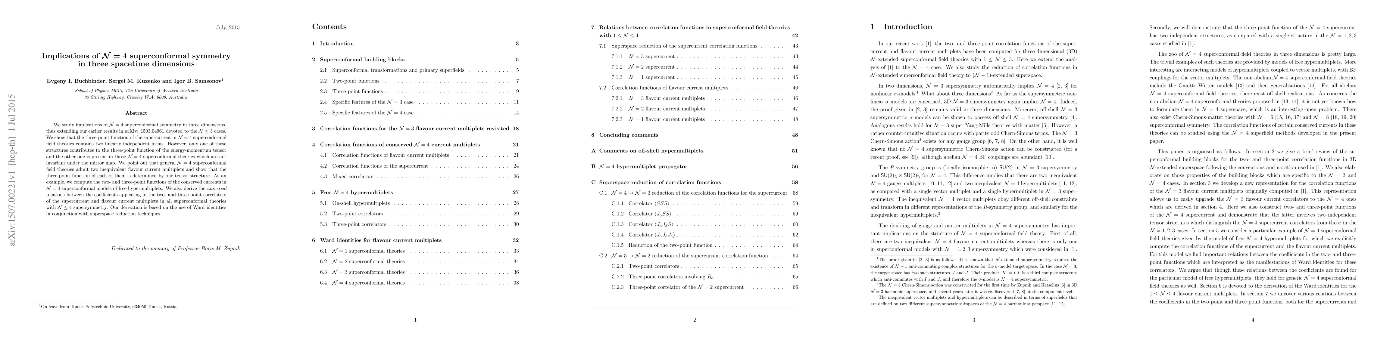 This paper extends previous work on N=1,2,3 superconformal symmetry to N=4 in three dimensions, revealing that the three-point function of the supercurrent has two forms, with only one contributing to the energy-momentum tensor. It also identifies two inequivalent flavour current multiplets in general N=4 theories and derives universal relations between correlator coefficients using Ward identities and superspace techniques.