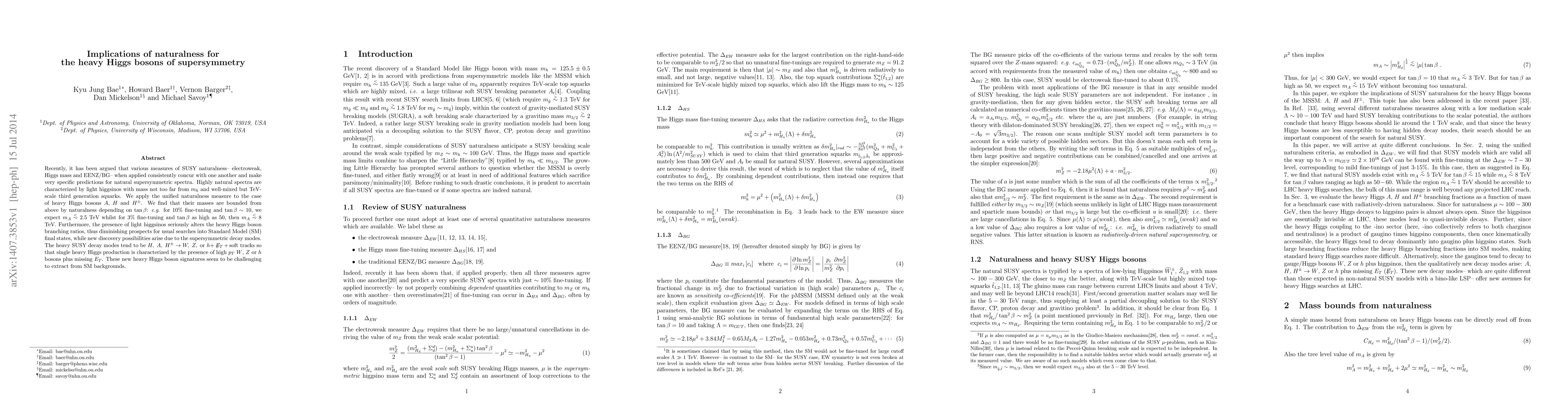 Recently, it has been argued that various measures of SUSY naturalness-- electroweak, Higgs mass and EENZ/BG-- when applied consistently concur with one another and make very specific predictions for natural supersymmetric spectra. Highly natural spectra are characterized by light higgsinos with mass not too far from m_h and well-mixed but TeV-scale third generation squarks. We apply the unified naturalness measure to the case of heavy Higgs bosons A, H and H^\pm. We find that their masses are bounded from above by naturalness depending on tan(beta): e.g. for 10% fine-tuning and tan(beta)~ 10, we expect m_A< 2.5 TeV whilst for 3% fine-tuning and tan(beta) as high as 50, then m_A< 8 TeV. Furthermore, the presence of light higgsinos seriously alters the heavy Higgs boson branching ratios, thus diminishing prospects for usual searches into Standard Model (SM) final states, while new discovery possibilities arise due to the supersymmetric decay modes. The heavy SUSY decay modes tend to be H, A, H^\pm-> W, Z, or h+MET + soft tracks so that single heavy Higgs production is characterized by the presence of high p_T W, Z or h bosons plus missing E_T. These new heavy Higgs boson signatures seem to be challenging to extract from SM backgrounds.