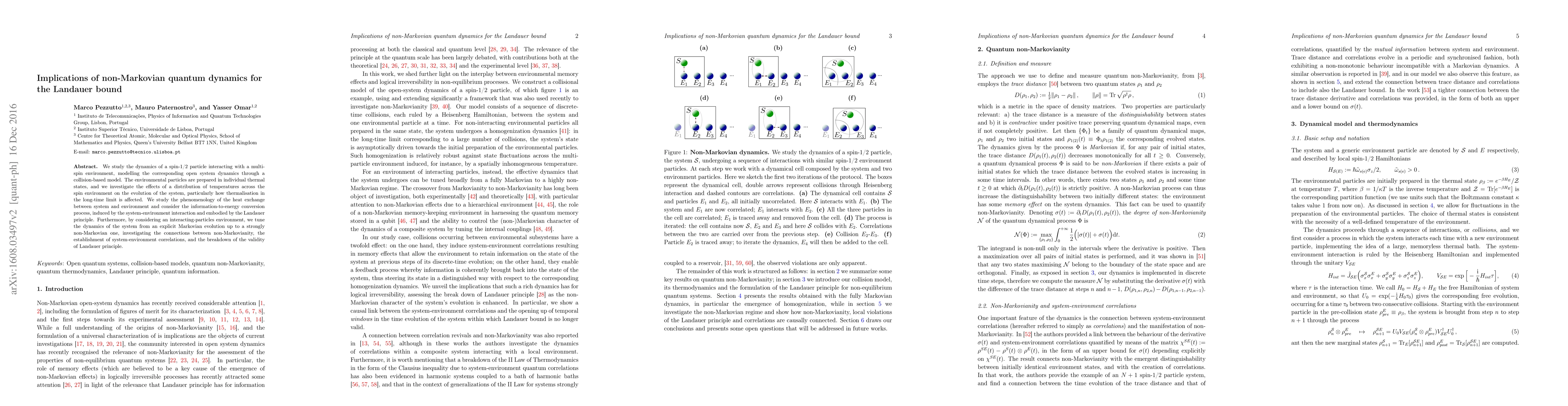 This paper explores the dynamics of a spin-1/2 particle interacting with a multi-spin environment, focusing on non-Markovian effects and their implications for the Landauer principle. It investigates how varying environmental temperatures affect thermalization and the breakdown of the Landauer bound due to system-environment correlations.