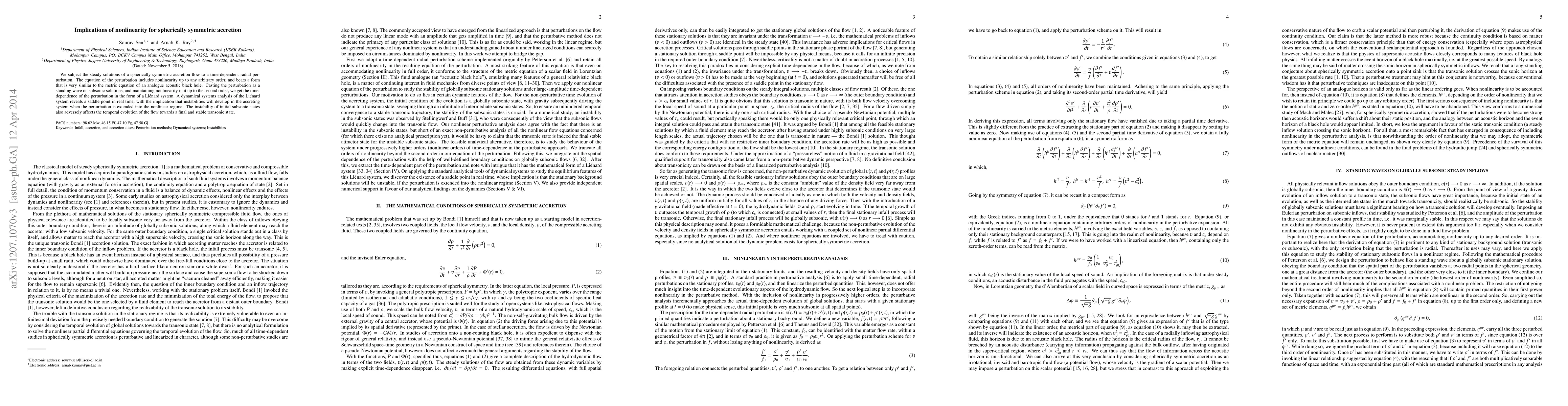 We subject the steady solutions of a spherically symmetric accretion flow to a time-dependent radial perturbation. The equation of the perturbation includes nonlinearity up to any arbitrary order, and bears a form that is very similar to the metric equation of an analogue acoustic black hole. Casting the perturbation as a standing wave on subsonic solutions, and maintaining nonlinearity in it up to the second order, we get the time-dependence of the perturbation in the form of a Li\'enard system. A dynamical systems analysis of the Li\'enard system reveals a saddle point in real time, with the implication that instabilities will develop in the accreting system when the perturbation is extended into the nonlinear regime. The instability of initial subsonic states also adversely affects the temporal evolution of the flow towards a final and stable transonic state.