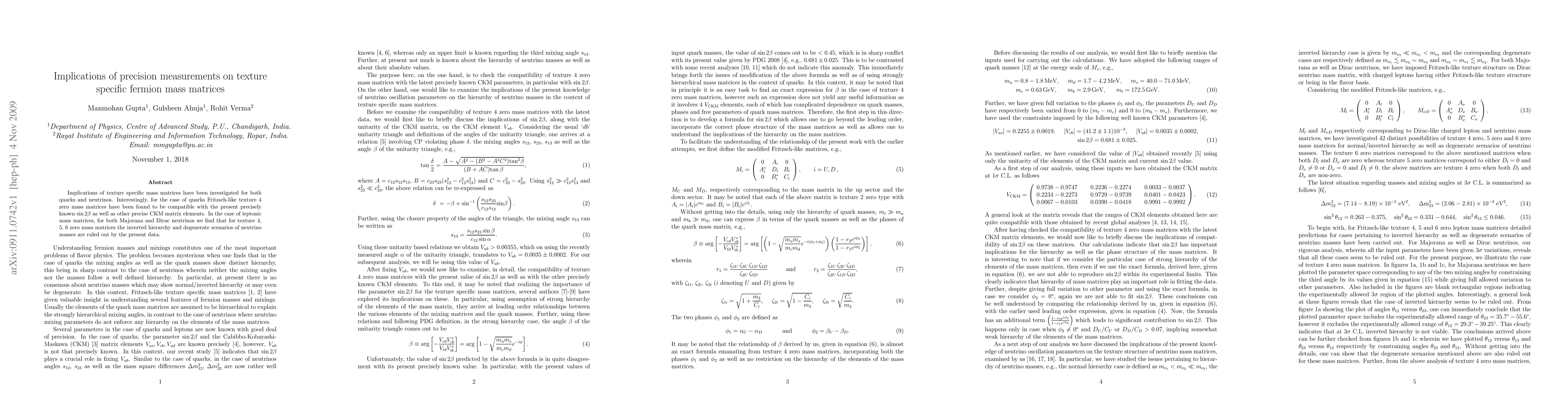 Implications of texture specific mass matrices have been investigated for both quarks and neutrinos. Interestingly, for the case of quarks Fritzsch-like texture 4 zero mass matrices have been found to be compatible with the present precisely known sin2\beta as well as other precise CKM matrix elements. In the case of leptonic mass matrices, for both Majorana and Dirac neutrinos we find that for texture 4, 5, 6 zero mass matrices the inverted hierarchy and degenerate scenarios of neutrino masses are ruled out by the present data.