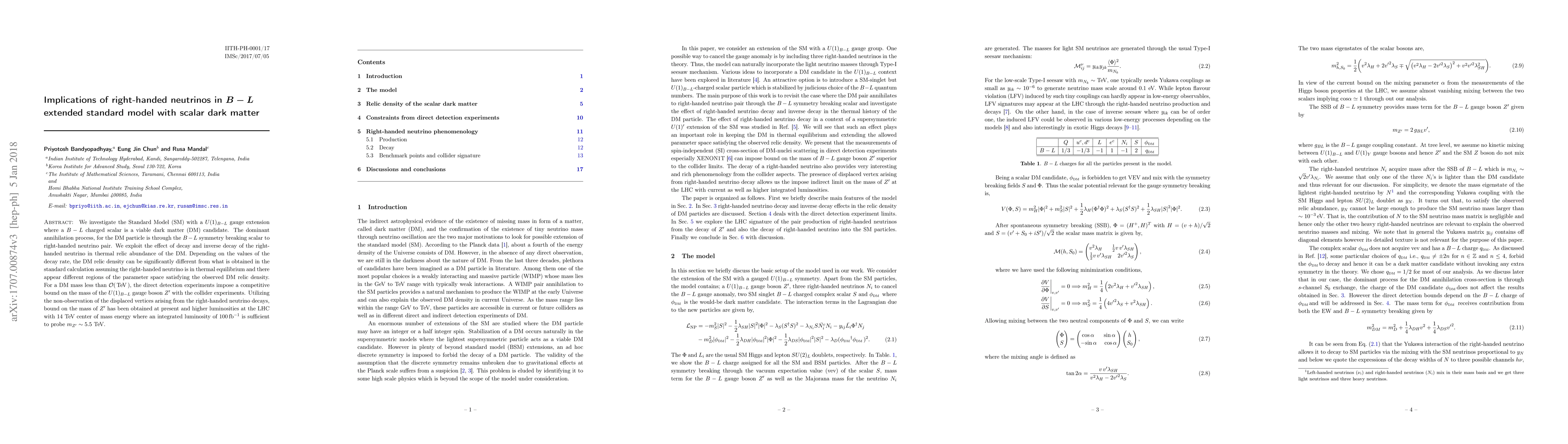 We investigate the Standard Model (SM) with a $U(1)_{B-L}$ gauge extension where a $B-L$ charged scalar is a viable dark matter (DM) candidate. The dominant annihilation process, for the DM particle is through the $B-L$ symmetry breaking scalar to right-handed neutrino pair. We exploit the effect of decay and inverse decay of the right-handed neutrino in thermal relic abundance of the DM. Depending on the values of the decay rate, the DM relic density can be significantly different from what is obtained in the standard calculation assuming the right-handed neutrino is in thermal equilibrium and there appear different regions of the parameter space satisfying the observed DM relic density. For a DM mass less than $\mathcal{O}$(TeV), the direct detection experiments impose a competitive bound on the mass of the $U(1)_{B-L}$ gauge boson $Z^\prime$ with the collider experiments. Utilizing the non-observation of the displaced vertices arising from the right-handed neutrino decays, bound on the mass of $Z^\prime$ has been obtained at present and higher luminosities at the LHC with 14 TeV centre of mass energy where an integrated luminosity of 100fb$^{-1}$ is sufficient to probe $m_{Z'} \sim 5.5$ TeV.