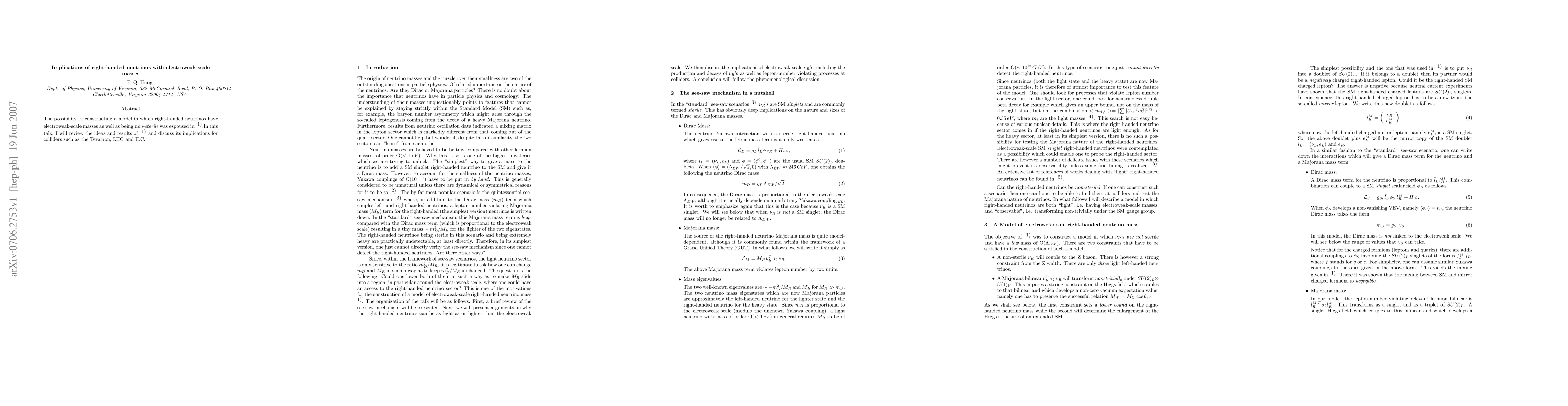 This paper explores the concept of right-handed neutrinos with electroweak-scale masses, as introduced in Ref. 1. It reviews the implications of such a model for various colliders, including Tevatron, LHC, and ILC.