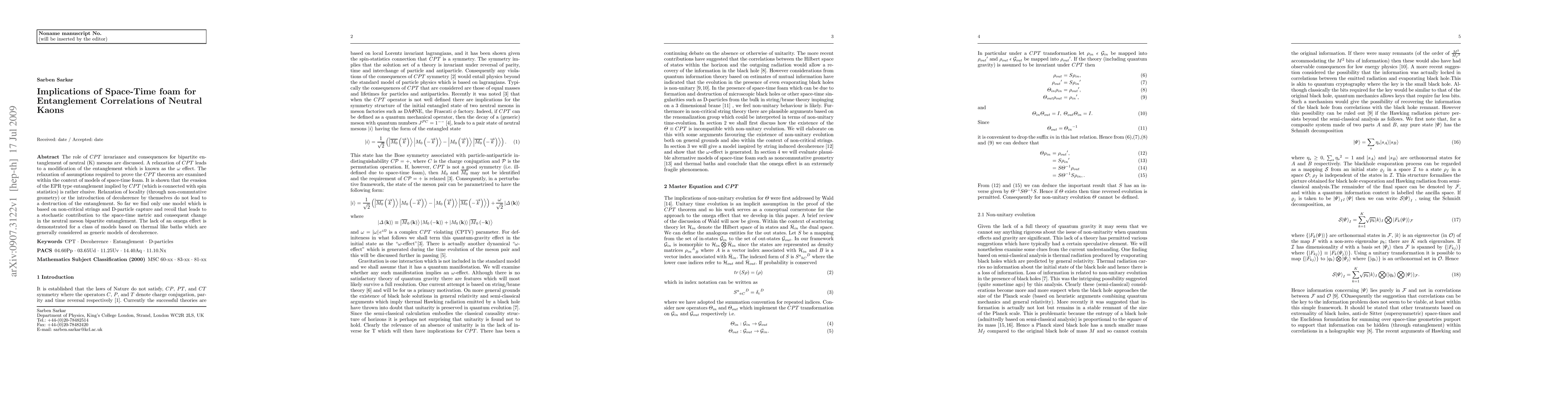 The role of $CPT$ invariance and consequences for bipartite entanglement of neutral (K) mesons are discussed. A relaxation of $CPT$ leads to a modification of the entanglement which is known as the $\omega$ effect. The relaxation of assumptions required to prove the $CPT$ theorem are examined within the context of models of space-time foam. It is shown that the evasion of the EPR type entanglement implied by $CPT$ (which is connected with spin statistics) is rather elusive. Relaxation of locality (through non-commutative geometry) or the introduction of decoherence by themselves do not lead to a destruction of the entanglement. So far we find only one model which is based on non-critical strings and D-particle capture and recoil that leads to a stochastic contribution to the space-time metric and consequent change in the neutral meson bipartite entanglement. The lack of an omega effect is demonstrated for a class of models based on thermal like baths which are generally considered as generic models of decoherence.