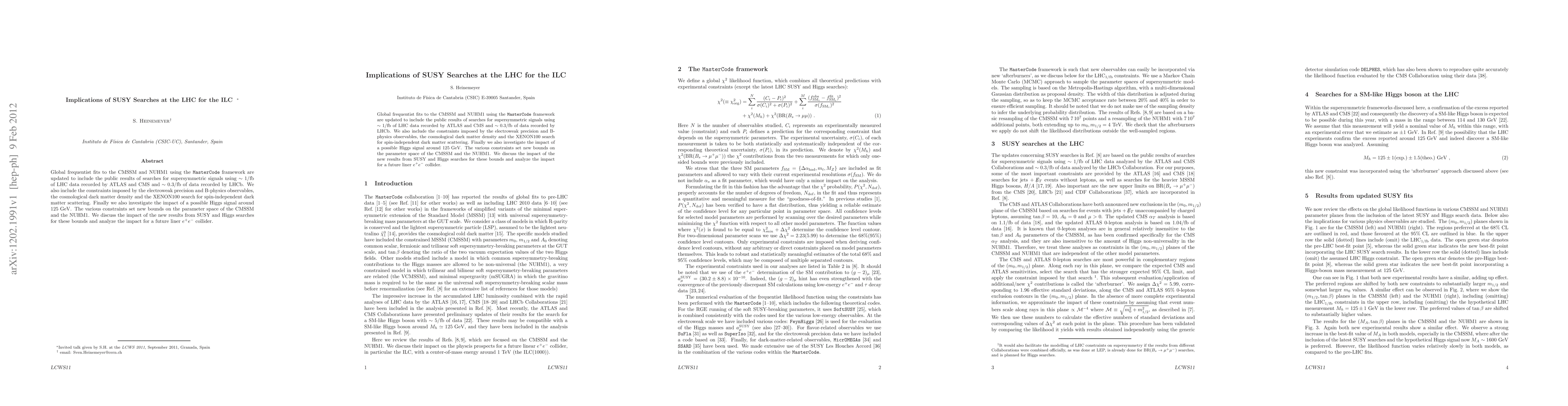 Global frequentist fits to the CMSSM and NUHM1 using the MasterCode framework are updated to include the public results of searches for supersymmetric signals using \sim 1/fb of LHC data recorded by ATLAS and CMS and \sim 0.3/fb of data recorded by LHCb. We also include the constraints imposed by the electroweak precision and B-physics observables, the cosmological dark matter density and the XENON100 search for spin-independent dark matter scattering. Finally we also investigate the impact of a possible Higgs signal around 125 GeV. The various constraints set new bounds on the parameter space of the CMSSM and the NUHM1. We discuss the impact of the new results from SUSY and Higgs searches for these bounds and analyze the impact for a future liner e^+e^- collider.
