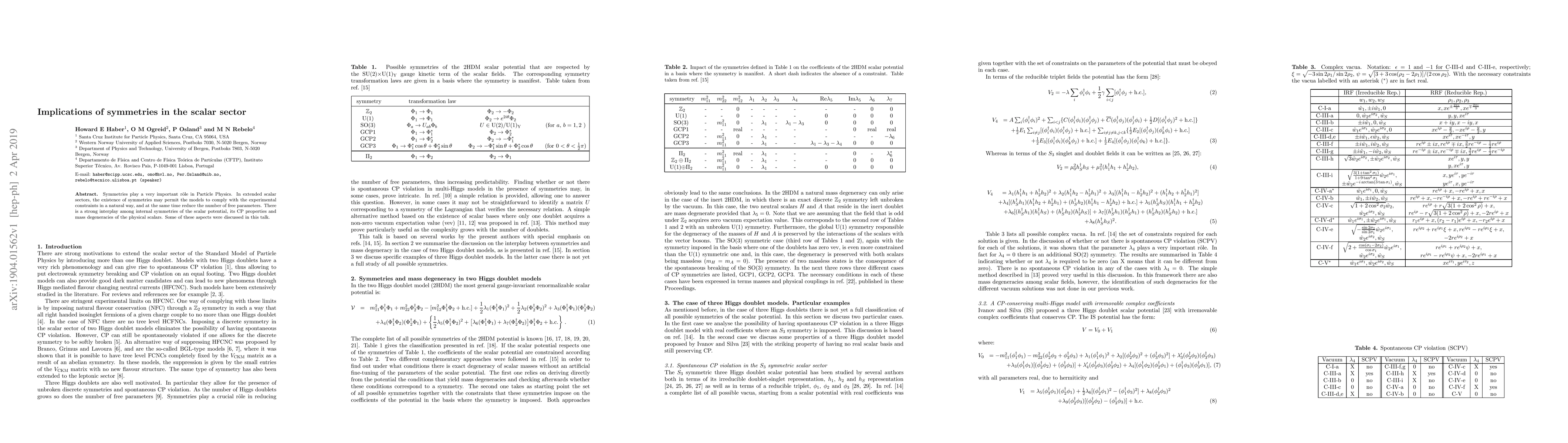 Symmetries play a very important r\^ole in Particle Physics. In extended scalar sectors, the existence of symmetries may permit the models to comply with the experimental constraints in a natural way, and at the same time reduce the number of free parameters. There is a strong interplay among internal symmetries of the scalar potential, its CP properties and mass degeneracies of the physical scalars. Some of these aspects were discussed in this talk.