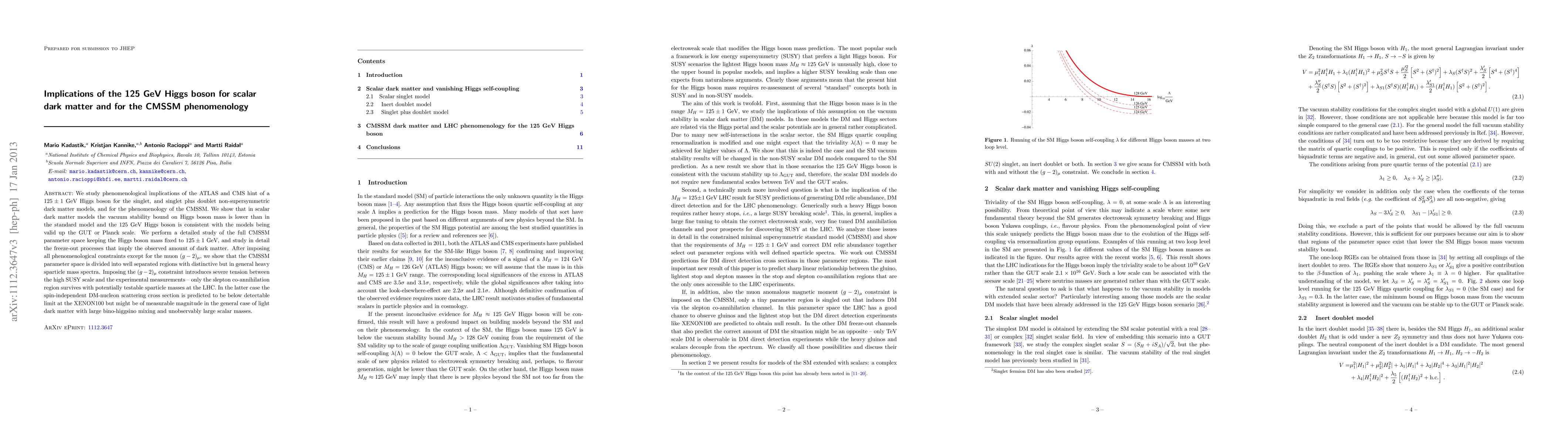 We study phenomenological implications of the ATLAS and CMS hint of a $125\pm 1$ GeV Higgs boson for the singlet, and singlet plus doublet non-supersymmetric dark matter models, and for the phenomenology of the CMSSM. We show that in scalar dark matter models the vacuum stability bound on Higgs boson mass is lower than in the standard model and the 125 GeV Higgs boson is consistent with the models being valid up the GUT or Planck scale. We perform a detailed study of the full CMSSM parameter space keeping the Higgs boson mass fixed to $125\pm 1$ GeV, and study in detail the freeze-out processes that imply the observed amount of dark matter. After imposing all phenomenological constraints except for the muon $(g-2)_\mu,$ we show that the CMSSM parameter space is divided into well separated regions with distinctive but in general heavy sparticle mass spectra. Imposing the $(g-2)_\mu$ constraint introduces severe tension between the high SUSY scale and the experimental measurements -- only the slepton co-annihilation region survives with potentially testable sparticle masses at the LHC. In the latter case the spin-independent DM-nucleon scattering cross section is predicted to be below detectable limit at the XENON100 but might be of measurable magnitude in the general case of light dark matter with large bino-higgsino mixing and unobservably large scalar masses.