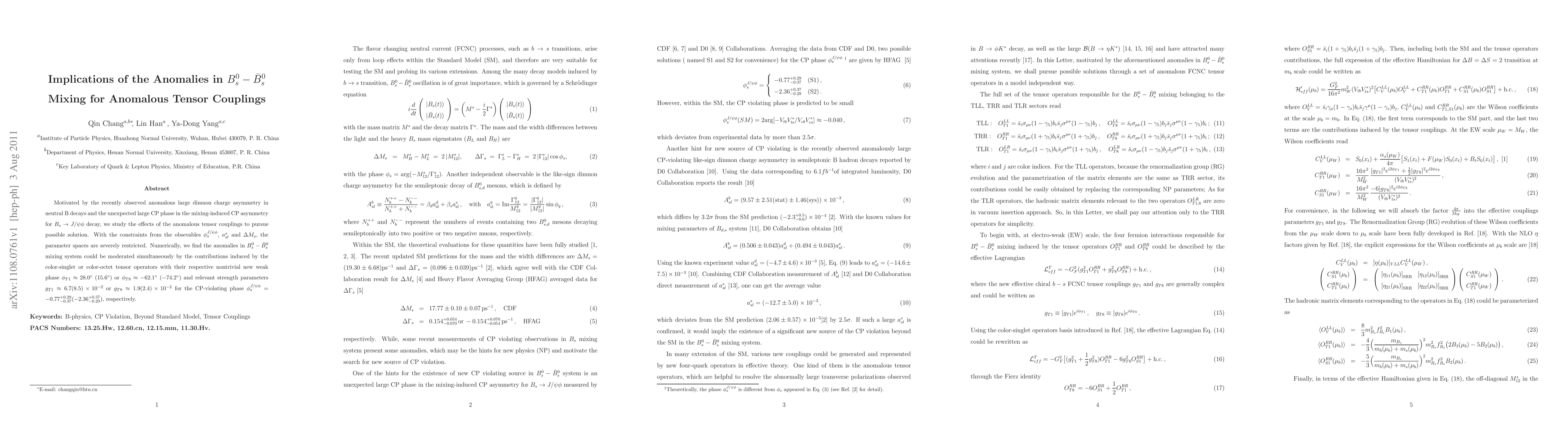 This paper explores how anomalies in B_s^0-ar{B}_s^0 mixing can be explained by anomalous tensor couplings, which moderate the large dimuon charge asymmetry and CP phase observed in neutral B decays.