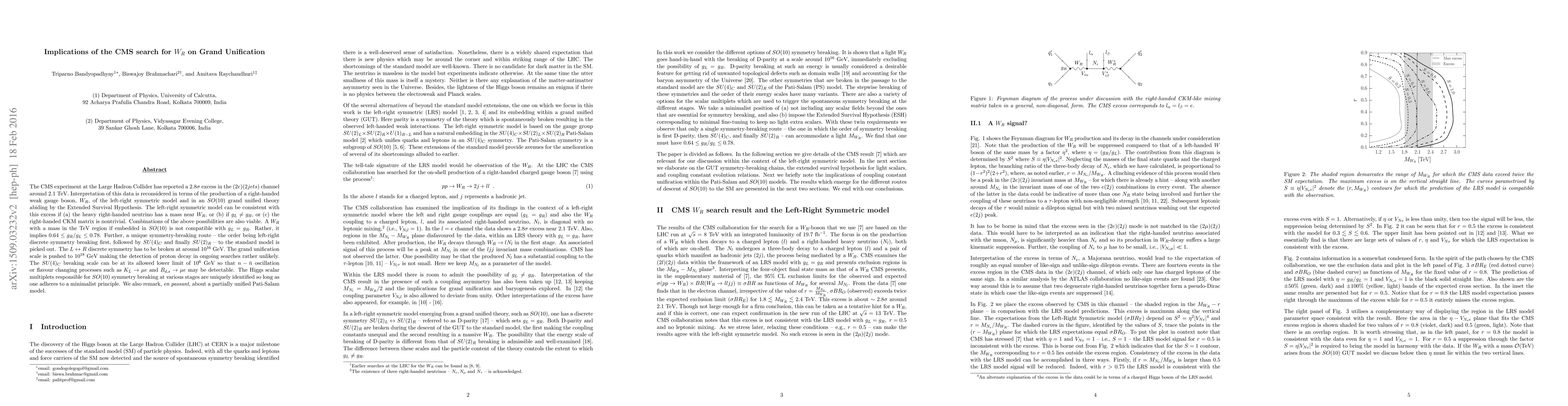 The CMS experiment at the Large Hadron Collider has reported a 2.8$\sigma$ excess in the $(2e)(2jets)$ channel around 2.1 TeV. Interpretation of this data is reconsidered in terms of the production of a right-handed weak gauge boson, $W_R$, of the left-right symmetric model and in an $SO(10)$ grand unified theory abiding by the Extended Survival Hypothesis. The left-right symmetric model can be consistent with this excess if (a) the heavy right-handed neutrino has a mass near $W_R$, or (b) if $g_L \neq g_R$, or (c) the right-handed CKM matrix is nontrivial. Combinations of the above possibilities are also viable. A $W_R$ with a mass in the TeV region if embedded in $SO(10)$ is not compatible with $g_L = g_R$. Rather, it implies $0.64 \leq g_R/g_L \leq 0.78$. Further, a unique symmetry-breaking route -- the order being left-right discrete symmetry breaking first, followed by $SU(4)_C$ and finally $SU(2)_R$ -- to the standard model is picked out. The $L \leftrightarrow R$ discrete symmetry has to be broken at around $10^{16}$ GeV. The grand unification scale is pushed to $10^{18}$ GeV making the detection of proton decay in ongoing searches rather unlikely. The $SU(4)_C$ breaking scale can be at its allowed lower limit of $10^6$ GeV so that $n - \bar{n}$ oscillation or flavour changing processes such as $K_L \rightarrow \mu e$ and $B_{d,s} \rightarrow \mu e$ may be detectable. The Higgs scalar multiplets responsible for $SO(10)$ symmetry breaking at various stages are uniquely identified so long as one adheres to a minimalist principle. We also remark, {\em en passant}, about a partially unified Pati-Salam model.