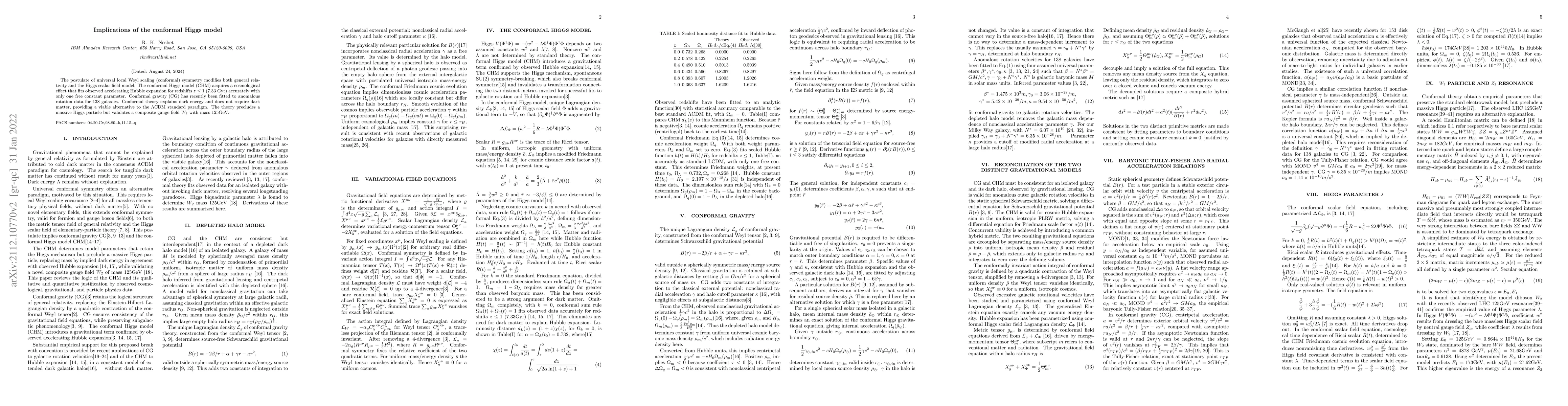 The conformal Higgs model proposes a universal local Weyl scaling symmetry that modifies general relativity and the Higgs field, explaining dark energy without dark matter and fitting the accelerating Hubble expansion. It also validates a composite gauge field $W_2$ with a mass of 125 GeV instead of a massive Higgs particle.