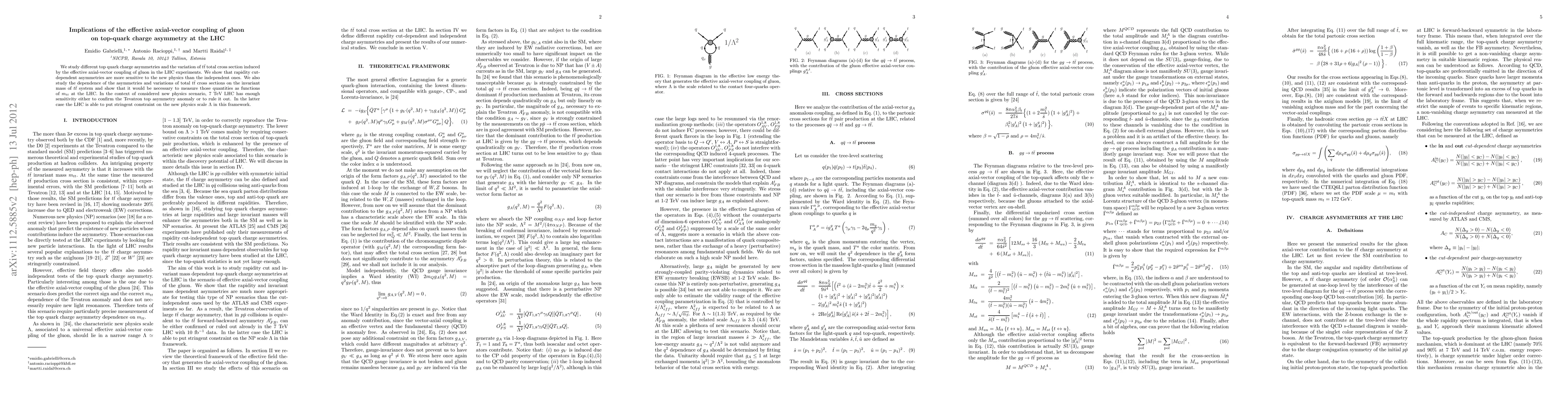 We study different top quark charge asymmetries and the variation of $t\bar t$ total cross section induced by the effective axial-vector coupling of gluon in the LHC experiments. We show that rapidity cut-dependent asymmetries are more sensitive to the new physics than the independent ones. We also study the dependence of the asymmetries and variations of total $t\bar t$ cross sections on the invariant mass of $t\bar t$ system and show that it would be necessary to measure those quantities as functions of $m_{tt}$ at the LHC. In the context of considered new physics scenario, 7 TeV LHC has enough sensitivity either to confirm the Tevatron top asymmetry anomaly or to rule it out. In the latter case the LHC is able to put stringent constraint on the new physics scale $\Lambda$ in this framework.
