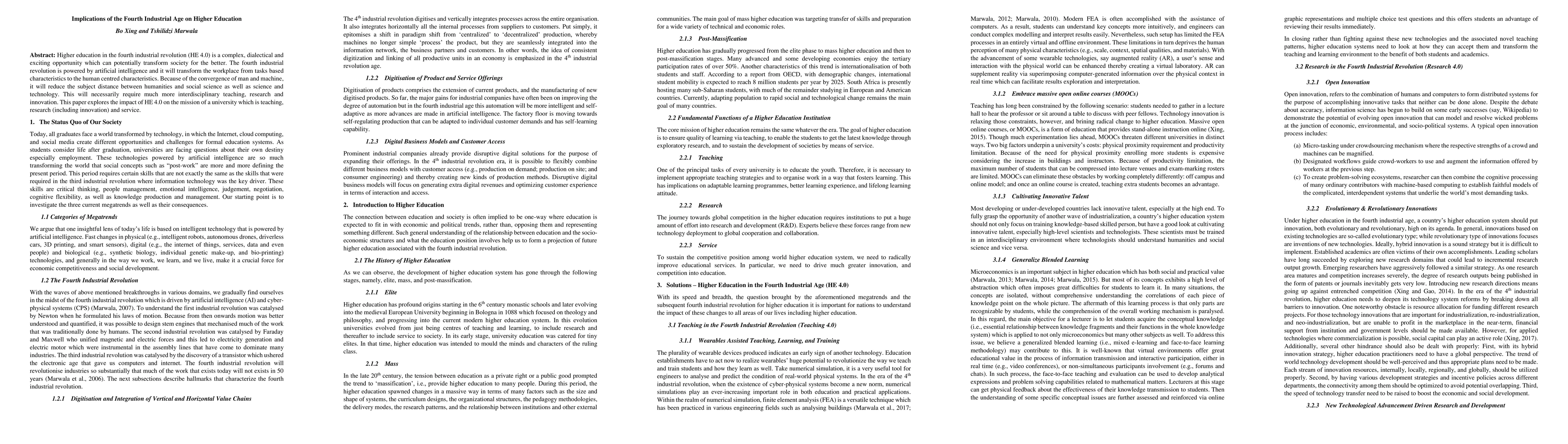 Higher education in the fourth industrial revolution, HE 4.0, is a complex, dialectical and exciting opportunity which can potentially transform society for the better. The fourth industrial revolution is powered by artificial intelligence and it will transform the workplace from tasks based characteristics to the human centred characteristics. Because of the convergence of man and machine, it will reduce the subject distance between humanities and social science as well as science and technology. This will necessarily require much more interdisciplinary teaching, research and innovation. This paper explores the impact of HE 4.0 on the mission of a university which is teaching, research (including innovation) and service.