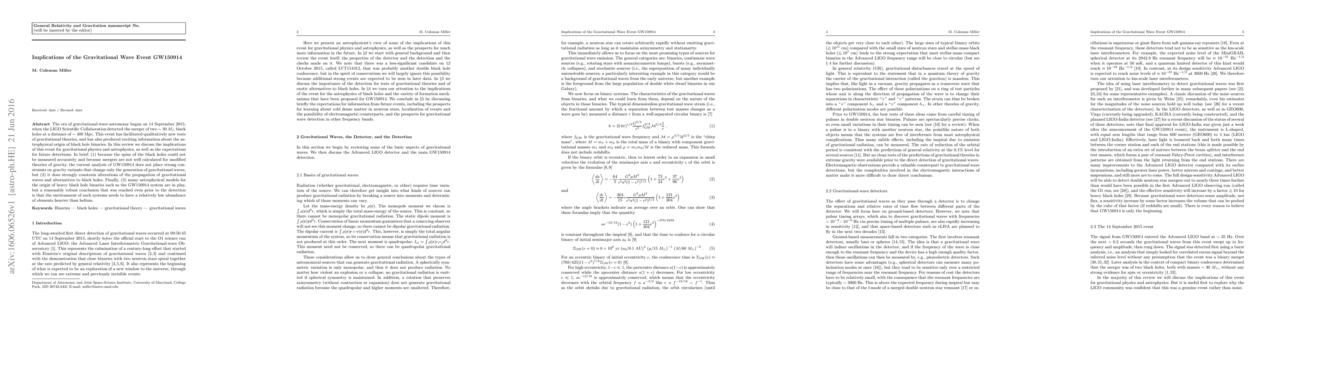 The era of gravitational-wave astronomy began on 14 September 2015, when the LIGO Scientific Collaboration detected the merger of two $\sim 30 M_\odot$ black holes at a distance of $\sim 400$ Mpc. This event has facilitated qualitatively new tests of gravitational theories, and has also produced exciting information about the astrophysical origin of black hole binaries. In this review we discuss the implications of this event for gravitational physics and astrophysics, as well as the expectations for future detections. In brief: (1) because the spins of the black holes could not be measured accurately and because mergers are not well calculated for modified theories of gravity, the current analysis of GW150914 does not place strong constraints on gravity variants that change only the generation of gravitational waves, but (2) it does strongly constrain alterations of the propagation of gravitational waves and alternatives to black holes. Finally, (3) many astrophysical models for the origin of heavy black hole binaries such as the GW150914 system are in play, but a reasonably robust conclusion that was reached even prior to the detection is that the environment of such systems needs to have a relatively low abundance of elements heavier than helium.