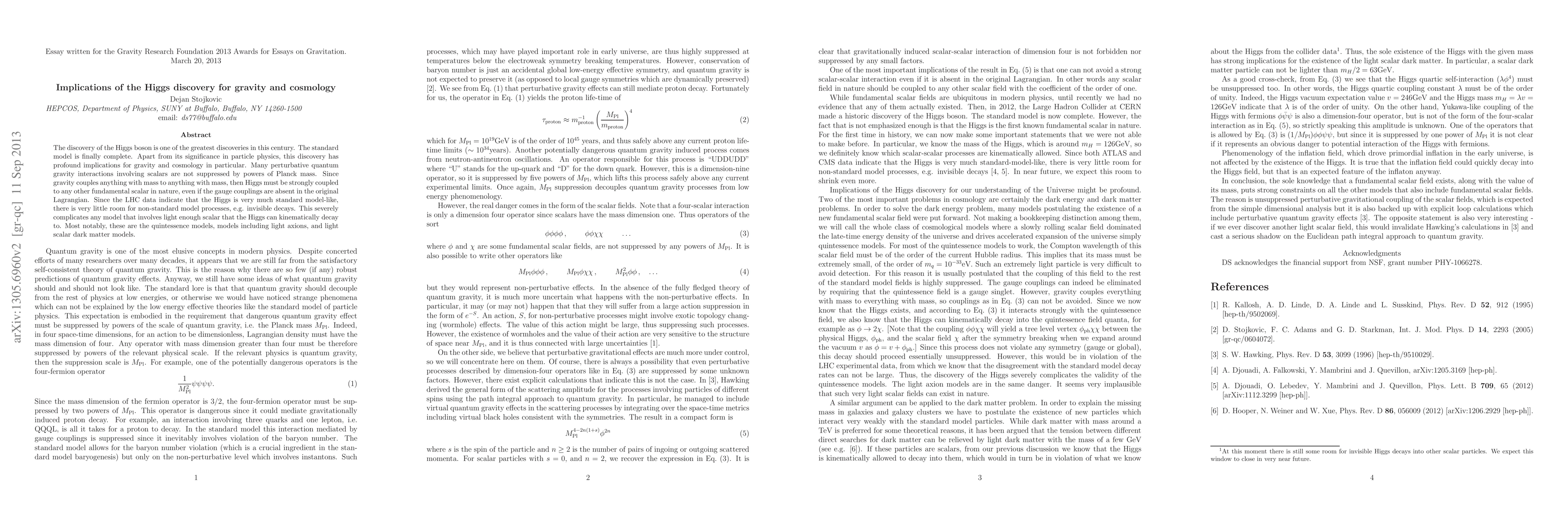 The discovery of the Higgs boson completes the standard model of particle physics and has significant implications for gravity and cosmology, particularly in limiting interactions involving scalars and complicating models of quintessence, axions, and light scalar dark matter. The standard model-like nature of the Higgs reduces the viability of non-standard decay processes.