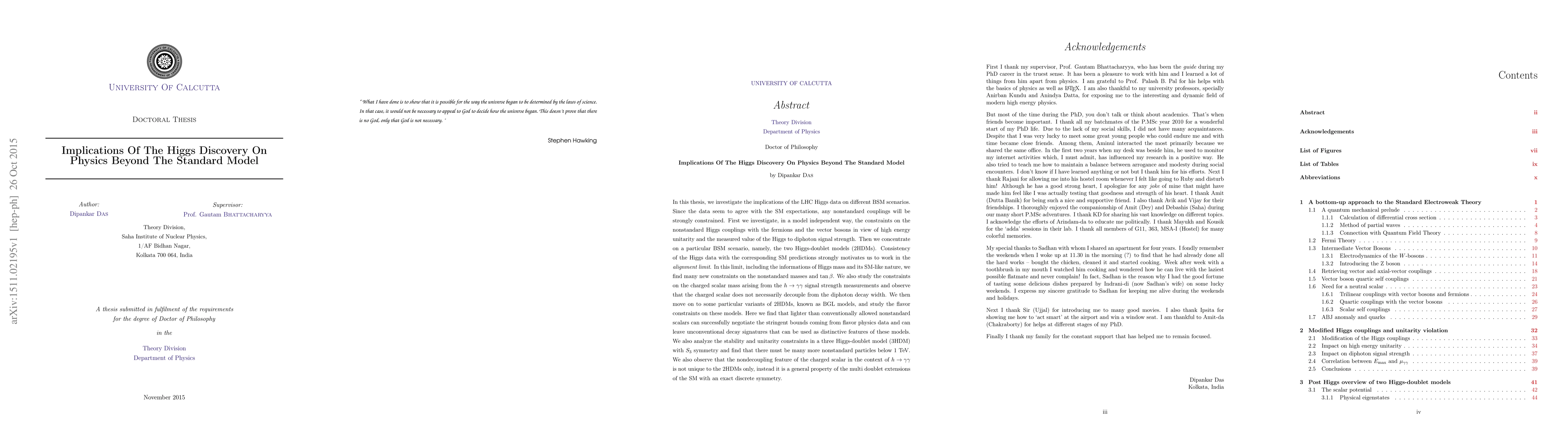 In this thesis, we investigate the implications of the LHC Higgs data on different BSM scenarios. Since the data seem to agree with the SM expectations, any nonstandard couplings will be strongly constrained. First we investigate, in a model independent way, the constraints on the nonstandard Higgs couplings with the fermions and the vector bosons in view of high energy unitarity and the measured value of the Higgs to diphoton signal strength. Then we concentrate on a particular BSM scenario, namely, the two Higgs-doublet models (2HDMs). Consistency of the Higgs data with the corresponding SM predictions strongly motivates us to work in the {\em alignment limit}. In this limit, including the informations of Higgs mass and its SM-like nature, we find many new constraints on the nonstandard masses and $\tan\beta$. We also study the constraints on the charged scalar mass arising from the $h\to \gamma\gamma$ signal strength measurements and observe that the charged scalar does not necessarily decouple from the diphoton decay width. We then move on to some particular variants of 2HDMs, known as BGL models, and study the flavor constraints on these models. Here we find that lighter than conventionally allowed nonstandard scalars can successfully negotiate the stringent bounds coming from flavor physics data and can leave unconventional decay signatures that can be used as distinctive features of these models. We also analyze the stability and unitarity constraints in a three Higgs-doublet model (3HDM) with $S_3$ symmetry and find that there must be many more nonstandard particles below 1~TeV. We also observe that the nondecoupling feature of the charged scalar in the context of $h\to \gamma\gamma$ is not unique to the 2HDMs only, instead it is a general property of the multi doublet extensions of the SM with an exact discrete symmetry.