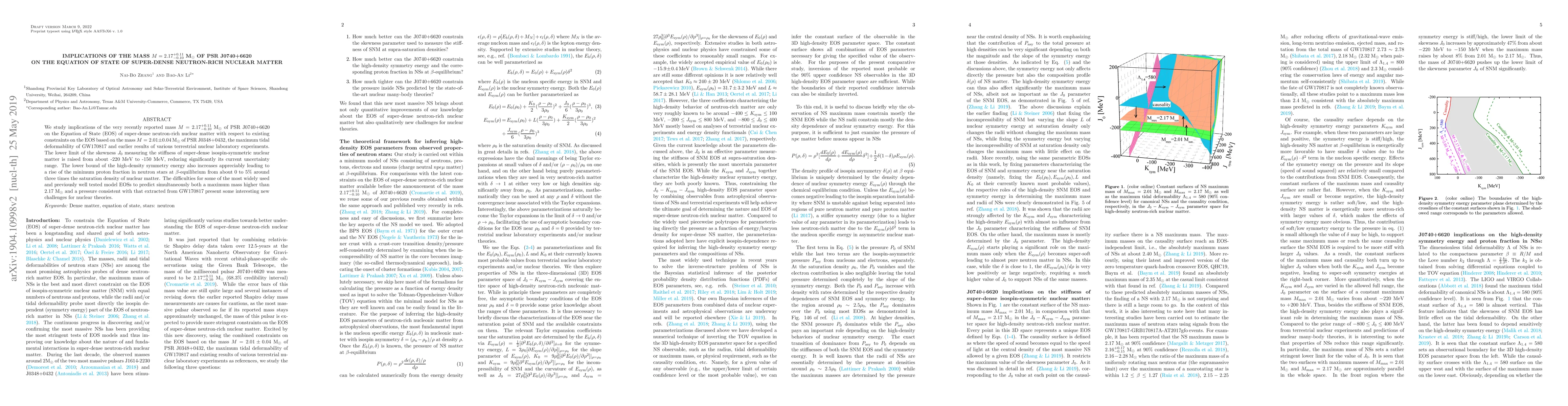 We study implications of the very recently reported mass $M=2.17^{+0.11}_{-0.10}$M$_\odot$ of PSR~J0740+6620 on the Equation of State (EOS) of super-dense neutron-rich nuclear matter with respect to existing constraints on the EOS based on the mass $M=2.01\pm 0.04$M$_\odot$ of PSR~J0348+0432, the maximum tidal deformability of GW170817 and earlier results of various terrestrial nuclear laboratory experiments. The lower limit of the skewness $J_0$ measuring the stiffness of super-dense isospin-symmetric nuclear matter is raised raised from about -220 MeV to -150 MeV, reducing significantly its current uncertainty range. The lower bound of the high-density symmetry energy also increases appreciably leading to a rise of the minimum proton fraction in neutron stars at $\beta$-equilibrium from about 0 to 5\% around three times the saturation density of nuclear matter. The difficulties for some of the most widely used and previously well tested model EOSs to predict simultaneously both a maximum mass higher than 2.17 M$_\odot$ and a pressure consistent with that extracted from GW170817 present some interesting new challenges for nuclear theories.