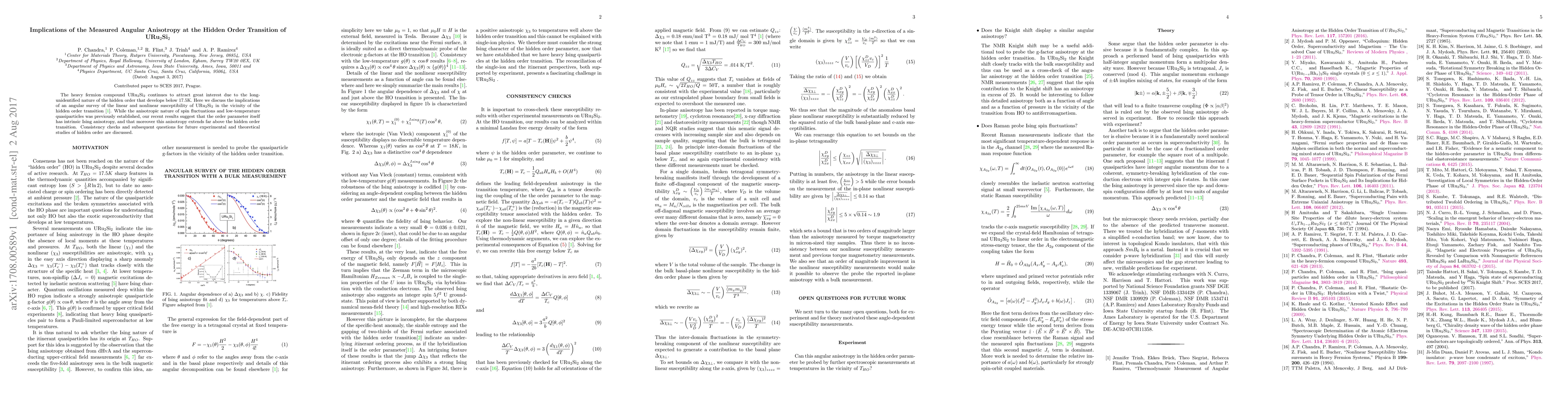 The heavy fermion compound URu2Si2 continues to attract great interest due to the long- unidentified nature of the hidden order that develops below 17.5K. Here we discuss the implications of an angular survey of the linear and nonlinear susceptibility of URu2Si2 in the vicinity of the hidden order transition. While the anisotropic nature of spin fluctuations and low-temperature quasiparticles was previously established, our recent results suggest that the order parameter itself has intrinsic Ising anisotropy, and that moreover this anisotropy extends far above the hidden order transition. Consistency checks and subsequent questions for future experimental and theoretical studies of hidden order are discussed.