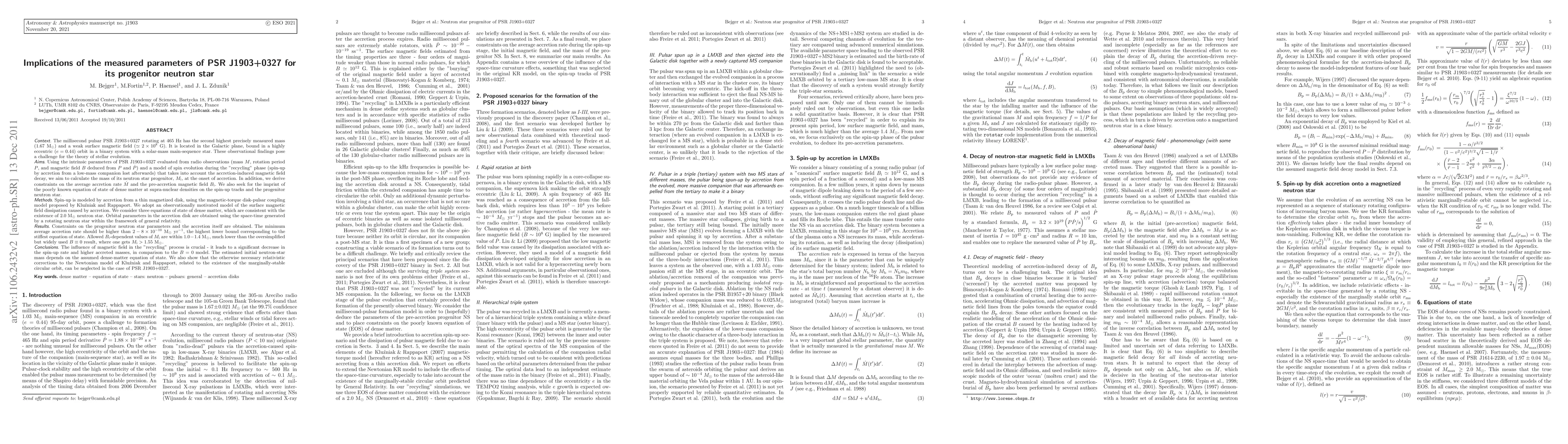 Using the intrinsic PSR J1903+0327 parameters evaluated from radio observations (mass, rotation period and dipole magnetic field deduced from the timing properties) we calculate the mass of its neutron star progenitor, M_i, at the onset of accretion. Simultaneously, we derive constraints on average accretion rate Mdot and the pre-accretion magnetic field B_i. Spin-up is modelled by accretion from a thin disk, using the magnetic-torque disk-pulsar coupling model proposed by Kluzniak and Rappaport (2007), improved for the existence of relativistic marginally-stable circular orbit. Orbital parameters in the disk are obtained using the space-time generated by a rotating neutron star in the framework of General Relativity. We employ an observationally motivated model of the surface magnetic field decay. We also seek for the imprint of the poorly known equation of state of dense matter on the spin-up tracks - three equations of state of dense matter, consistent with the existence of 2 Msun neutron star, are considered. We find that the minimum average accretion rate should be larger than 2-8 10^(-10) Msun/yr, the highest lower bound corresponding to the stiffest equation of state. We conclude that the influence of magnetic field in the "recycling" process is crucial - it leads to a significant decrease of spin-up rate and larger accreted masses, in comparison to the B=0 model. Allowed B_i-dependent values of M_i are within 1.0-1.4 Msun, i.e., much lower than an oversimplified but widely used B=0 result, where one gets M_i>1.55 Msun. Estimated initial neutron-star mass depends on the assumed dense-matter equation of state.