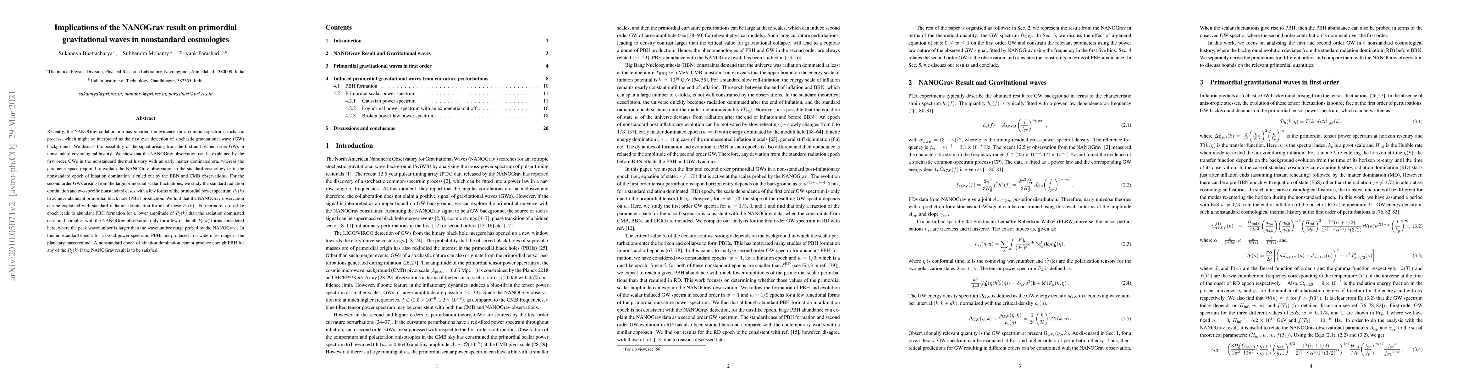 The research explores the implications of the NANOGrav result on primordial gravitational waves in nonstandard cosmologies, analyzing first and second-order GWs in various cosmological histories.