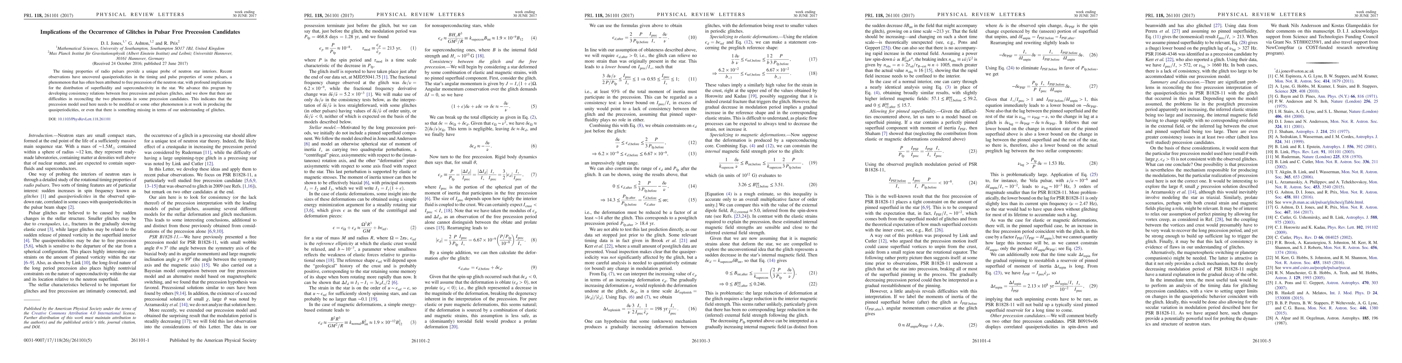 The research explores the relationship between pulsar glitches and free precession, suggesting that current precession models may need modification or alternative explanations for observed quasiperiodicities, due to inconsistencies found.