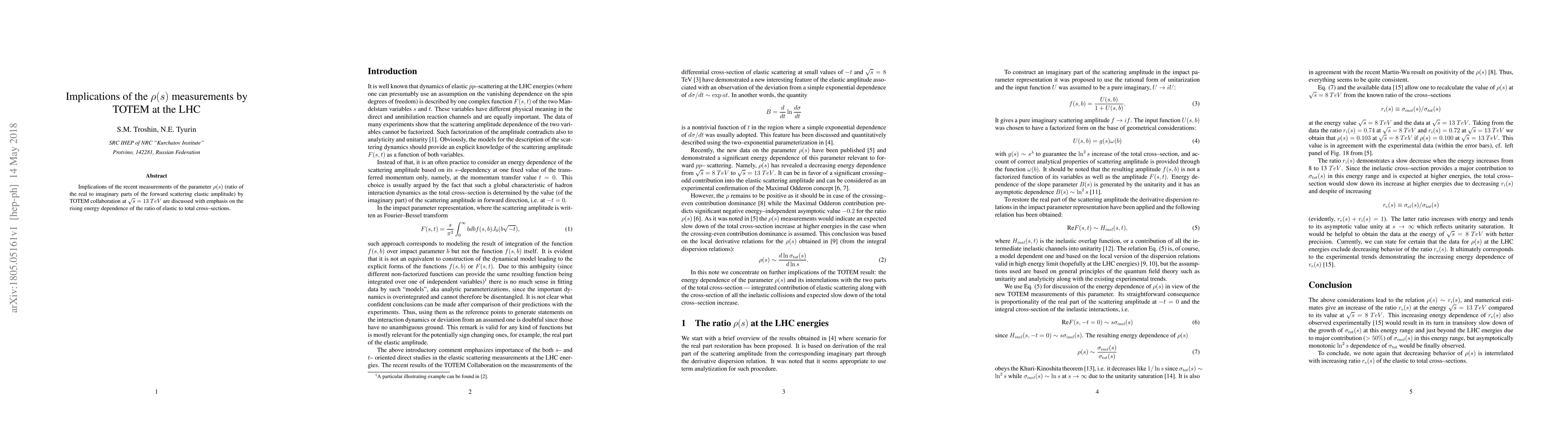 Implications of the recent measurements of the parameter $\rho(s)$ (ratio of the real to imaginary parts of the forward scattering elastic amplitude) by TOTEM collaboration at $\sqrt{s}=13$ $TeV$ are discussed with emphasis on the rising energy dependence of the ratio of elastic to total cross--sections.