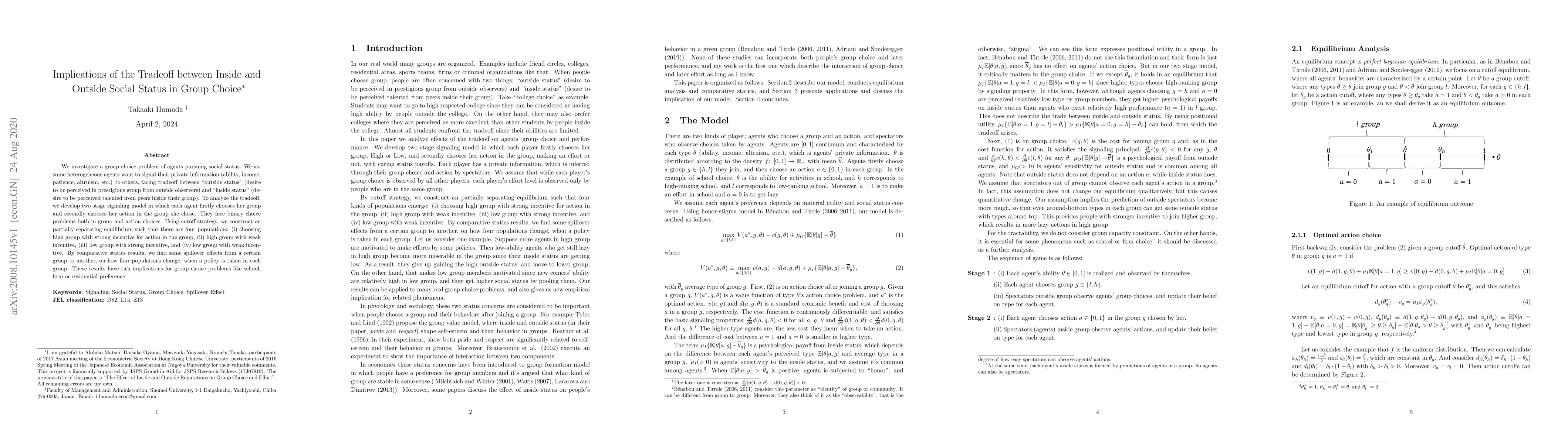 We investigate a group choice problem of agents pursuing social status. We assume heterogeneous agents want to signal their private information (ability, income, patience, altruism, etc.) to others, facing tradeoff between "outside status" (desire to be perceived in prestigious group from outside observers) and "inside status" (desire to be perceived talented from peers inside their group). To analyze the tradeoff, we develop two stage signaling model in which each agent firstly chooses her group and secondly chooses her action in the group she chose. They face binary choice problems both in group and action choices. Using cutoff strategy, we construct an partially separating equilibrium such that there are four populations: (i) choosing high group with strong incentive for action in the group, (ii) high group with weak incentive, (iii) low group with strong incentive, and (iv) low group with weak incentive. By comparative statics results, we find some spillover effects from a certain group to another, on how four populations change, when a policy is taken in each group. These results have rich implications for group choice problems like school, firm or residential preference.