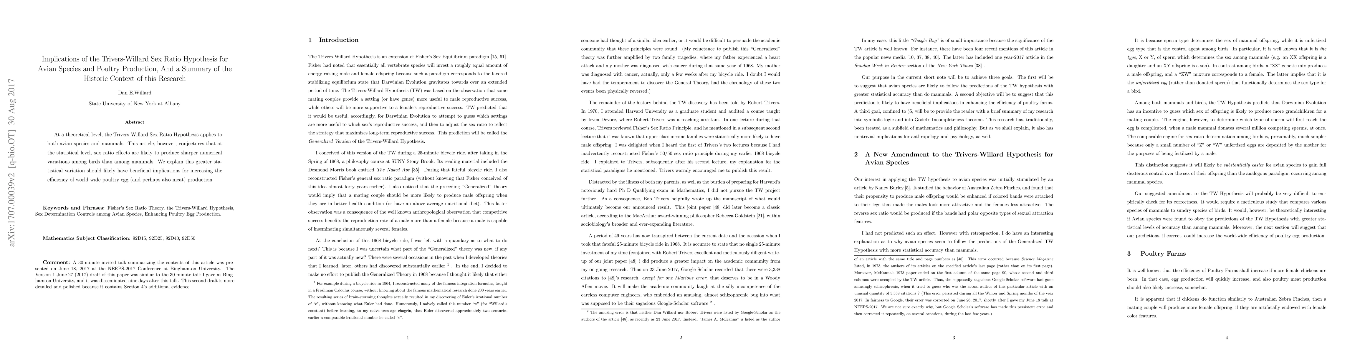 At a theoretical level, the Trivers-Willard Sex Ratio Hypothesis applies to both avian species and mammals. This article, however, conjectures that at the statistical level, sex ratio effects are likely to produce sharper numerical variations among birds than among mammals. We explain this greater statistical variation should likely have beneficial implications for increasing the efficiency of world-wide poultry egg (and perhaps also meat) production.