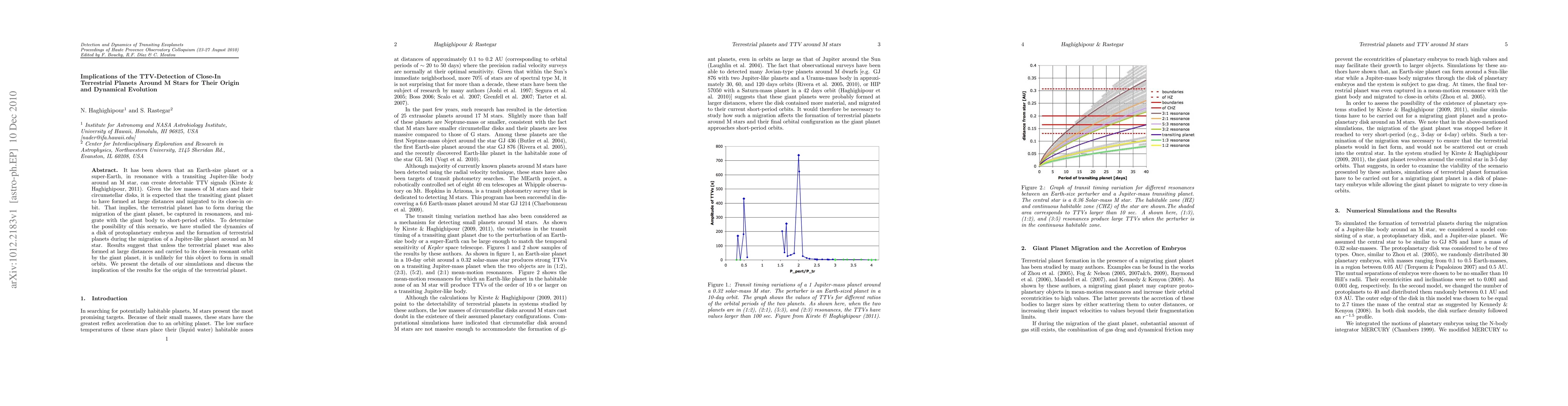 It has been shown that an Earth-size planet or a super-Earth, in resonance with a transiting Jupiter-like body in a short-period orbit around an M star, can create detectable TTV signals (Kirste \& Haghighipour, 2011). Given the low masses of M stars and their circumstellar disks, it is expected that such a transiting giant planet to have formed at large distances and migrated to its close-in orbit. That implies, if such systems are discovered around M stars, the terrestrial planet had to form during the migration of the giant planet. The formation of this object may be either in-situ (in a close-in orbit) followed by its capture in resonance, or the object is formed at larger distances where it was subsequently captured in a resonance with the migrating giant planet. We have investigated these two scenarios by simulating the dynamics of a disk of protoplanetary embryos and the formation of terrestrial planets during the migration of a Jupiter-like planet around an M star. Results suggest that unless the migration of the giant planet is very slow (slower than 1E-7 AU/year), it is unlikely that the close-in terrestrial planet is formed in-situ. If a terrestrial planet is detected in a mean-motion resonance with a close-in giant planet around an M star, the terrestrial planet was most likley formed at large distances and carried to its close-in resonant orbit by the migrating giant body.