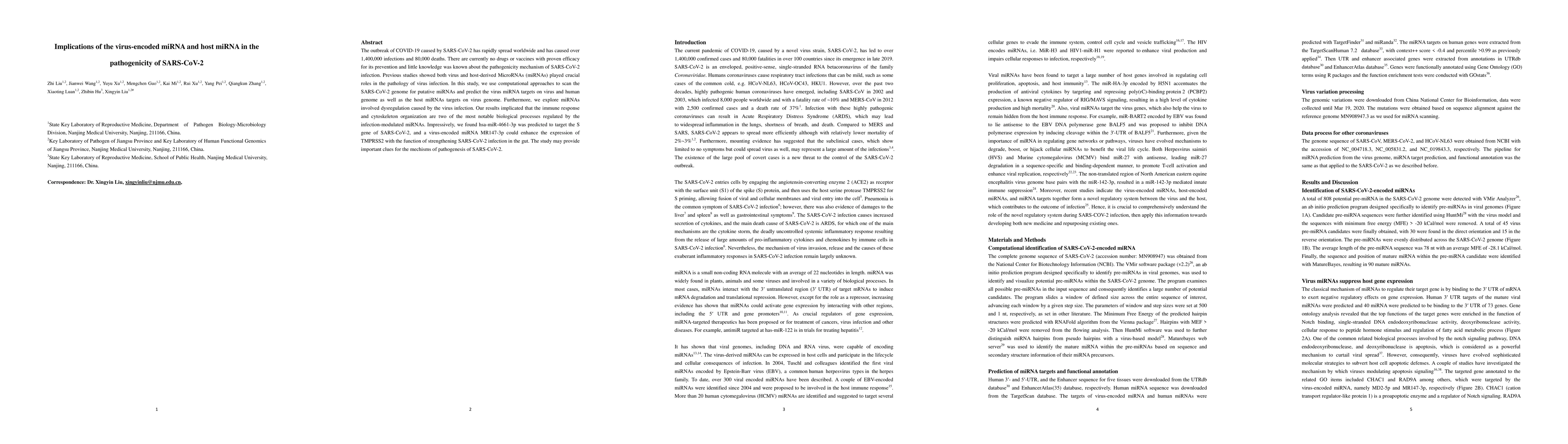 This study uses computational methods to identify virus-encoded and host miRNAs involved in SARS-CoV-2 infection and their targets, revealing that immune response and cytoskeleton organization are key regulated processes. Notably, hsa-miR-4661-3p targets the S gene, while a virus-encoded miRNA enhances TMPRSS2 expression, suggesting mechanisms for SARS-CoV-2 pathogenesis.