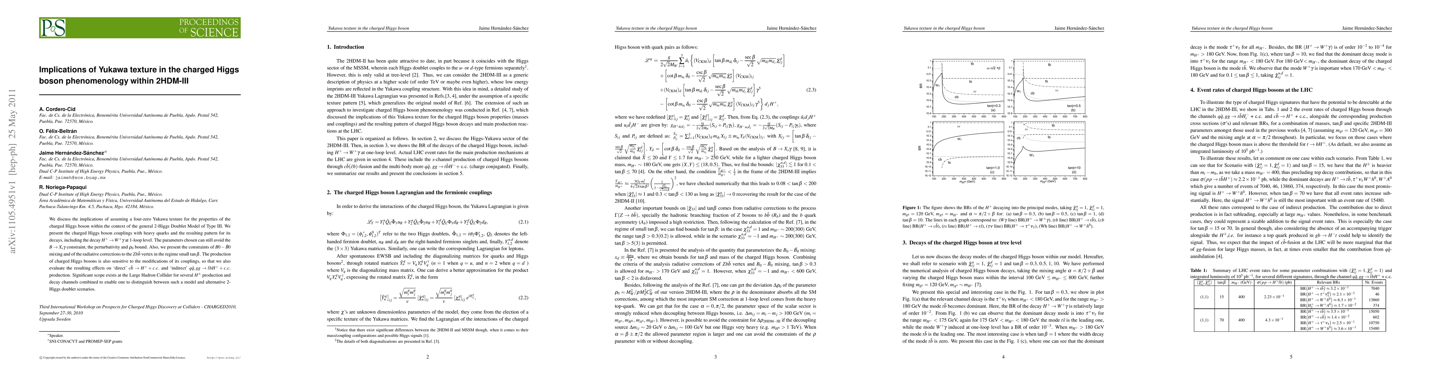 We discuss the implications of assuming a four-zero Yukawa texture for the properties of the charged Higgs boson within the context of the general 2-Higgs Doublet Model of Type III. We present the charged Higgs boson couplings with heavy quarks and the resulting pattern for its decays, including the decay $H^+ \to W^+ \gamma$ at 1-loop level. The parameters chosen can still avoid the $B \to X_s \gamma$ constraint, the perturbativity and $\rho_0$ bound. Also, we present the constraints of $ B0-\bar{B}0$ mixing and of the radiative corrections to the $Z b \bar{b}$ vertex in the regime small $ \tan \beta$. The production of charged Higgs bosons is also sensitive to the modifications of its couplings, so that we also evaluate the resulting effects on `direct' $c\bar{b}\to H^++c. c.$ and `indirect' $q\bar q,gg\to \bar t b H^++c. c.$ production. Significant scope exists at the Large Hadron Collider for several $H^\pm$ production and decay channels combined to enable one to distinguish between such a model and alternative 2-Higgs doublet scenarios.
