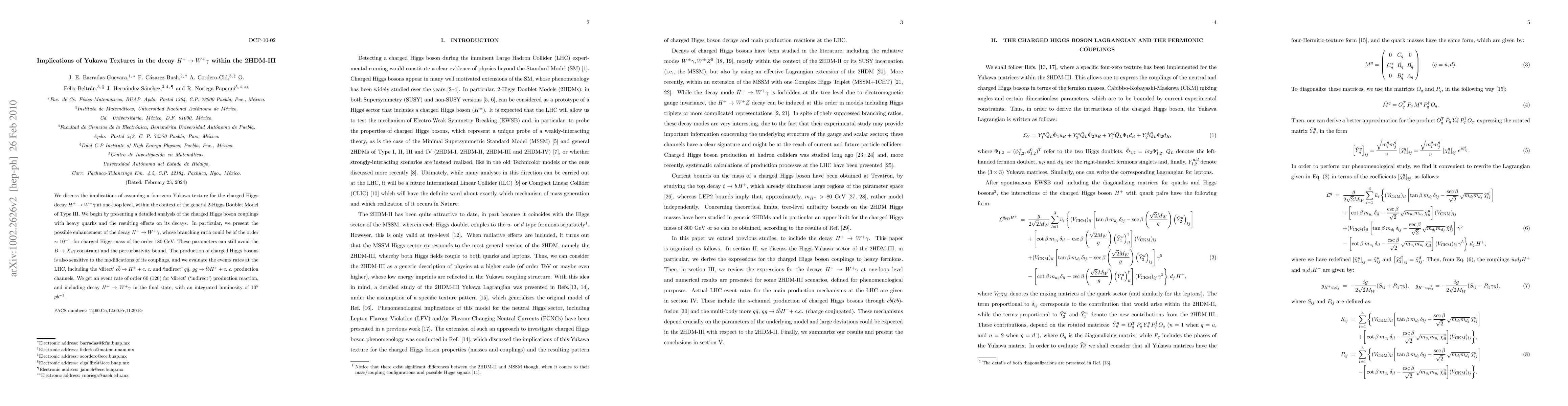 We discuss the implications of assuming a four-zero Yukawa texture for the charged Higgs decay $H^+ \to W^+ \gamma$ at one-loop level, within the context of the general 2-Higgs Doublet Model of Type III. We begin by presenting a detailed analysis of the charged Higgs boson couplings with heavy quarks and the resulting effects on its decays. In particular, we present the possible enhancement of the decay $H^+ \to W^+ \gamma$, whose branching ratio could be of the order $\sim 10^{-1}$, for charged Higgs mass of the order 180 GeV. These parameters can still avoid the $B \to X_s \gamma$ constraint and the perturbativity bound. The production of charged Higgs bosons is also sensitive to the modifications of its couplings, and we evaluate the events rates at the LHC, including the `direct' $c\bar{b}\to H^++c. c.$ and `indirect' $q\bar q, gg \to \bar t b H^++c. c.$ production channels. We get an event rate of order 60 (120) for `direct' (`indirect') production reaction, and including decay $H^+ \to W^+ \gamma $ in the final state, with an integrated luminosity of $10^5$ $pb^{-1}$.