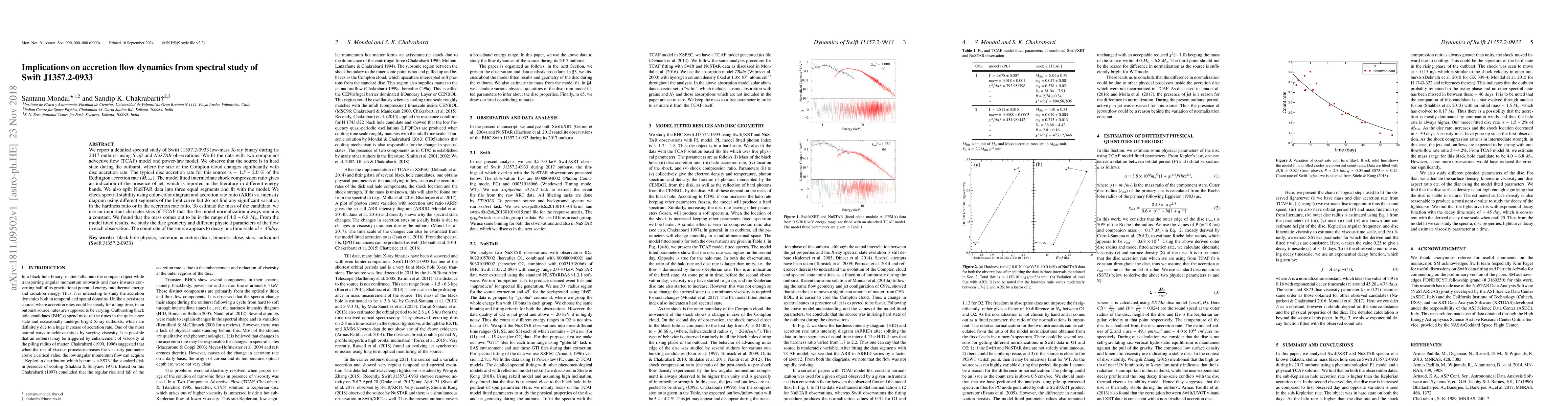We report a detailed spectral study of Swift~J1357.2-0933 low-mass X-ray binary during its 2017 outburst using {\it Swift} and {\it NuSTAR} observations. We fit the data with two component advective flow (TCAF) model and power-law model. We observe that the source is in hard state during the outburst, where the size of the Compton cloud changes significantly with disc accretion rate. The typical disc accretion rate for this source is $\sim 1.5-2.0~\%$ of the Eddington accretion rate $(\dot M_{Edd})$. The model fitted intermediate shock compression ratio gives an indication of the presence of jet, which is reported in the literature in different energy bands. We also split NuSTAR data into three equal segments and fit with the model. We check spectral stability using color-color diagram and accretion rate ratio (ARR) vs. intensity diagram using different segments of the light curve but do not find any significant variation in the hardness ratio or in the accretion rate ratio. To estimate the mass of the candidate, we use an important characteristics of TCAF that the the model normalization always remains a constant. We found that the mass comes out to be in the range of $4.0-6.8~M_\odot$. From the model fitted results, we study the disc geometry and different physical parameters of the flow in each observation. The count rate of the source appears to decay in a time scale of $\sim 45 day$.