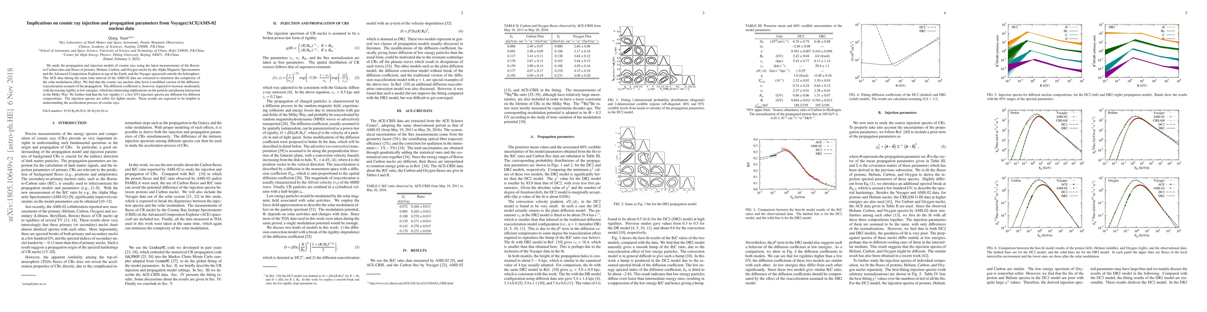 This study analyzes cosmic ray propagation and injection models using data from AMS-02, ACE, and Voyager, finding that a modified diffusion-reacceleration scenario fits the Boron-to-Carbon ratio and nucleus flux measurements. The results suggest that the diffusion coefficient should increase with decreasing rigidity at low energies, indicating different, softer injection spectra for lighter nuclei.