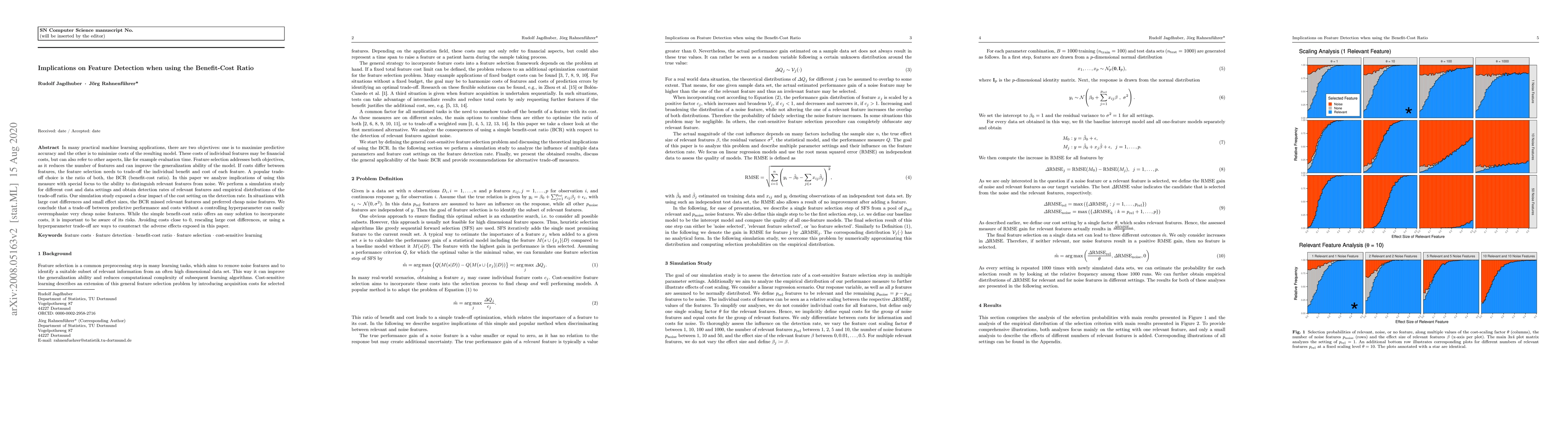 In many practical machine learning applications, there are two objectives: one is to maximize predictive accuracy and the other is to minimize costs of the resulting model. These costs of individual features may be financial costs, but can also refer to other aspects, like for example evaluation time. Feature selection addresses both objectives, as it reduces the number of features and can improve the generalization ability of the model. If costs differ between features, the feature selection needs to trade-off the individual benefit and cost of each feature. A popular trade-off choice is the ratio of both, the BCR (benefit-cost ratio). In this paper we analyze implications of using this measure with special focus to the ability to distinguish relevant features from noise. We perform a simulation study for different cost and data settings and obtain detection rates of relevant features and empirical distributions of the trade-off ratio. Our simulation study exposed a clear impact of the cost setting on the detection rate. In situations with large cost differences and small effect sizes, the BCR missed relevant features and preferred cheap noise features. We conclude that a trade-off between predictive performance and costs without a controlling hyperparameter can easily overemphasize very cheap noise features. While the simple benefit-cost ratio offers an easy solution to incorporate costs, it is important to be aware of its risks. Avoiding costs close to 0, rescaling large cost differences, or using a hyperparameter trade-off are ways to counteract the adverse effects exposed in this paper.