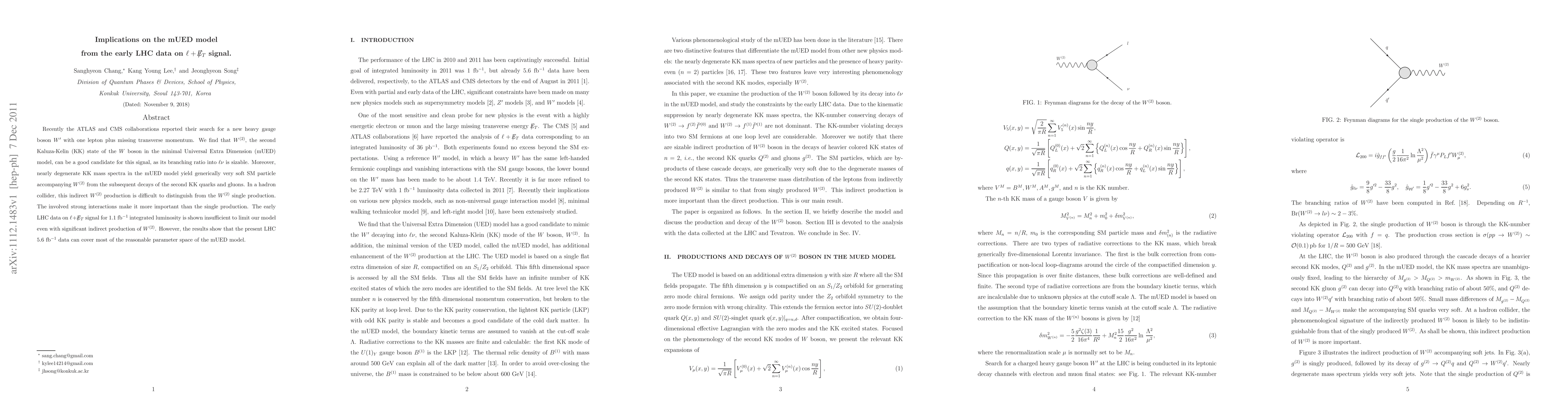 Recently the ATLAS and CMS collaborations reported their search for a new heavy gauge boson $W'$ with one lepton plus missing transverse momentum. We find that $W^{(2)}$, the second Kaluza-Kelin (KK) state of the $W$ boson in the minimal Universal Extra Dimension (mUED) model, can be a good candidate for this signal, as its branching ratio into $\ell\nu$ is sizable. Moreover, nearly degenerate KK mass spectra in the mUED model yield generically very soft SM particle accompanying $W^{(2)}$ from the subsequent decays of the second KK quarks and gluons. In a hadron collider, this indirect $W^{(2)}$ production is difficult to distinguish from the $W^{(2)}$ single production. The involved strong interactions make it more important than the single production. The early LHC data on $\ell+\met$ signal for 1.1 fb$^{-1}$ integrated luminosity is shown insufficient to limit our model even with significant indirect production of $W^{(2)}$. However, the results show that the present LHC 5.6 fb$^{-1}$ data can cover most of the reasonable parameter space of the mUED model.