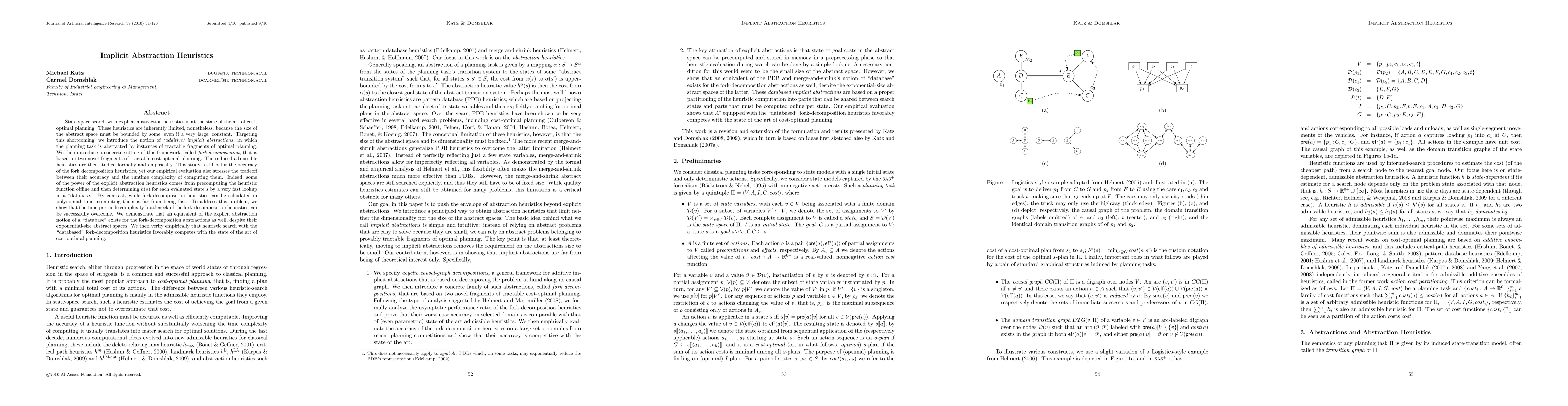 This paper introduces implicit abstraction heuristics for cost-optimal planning, specifically through a novel fork-decomposition framework. While these heuristics show promising accuracy, they are computationally intensive; the authors propose a database-based approach to mitigate this issue, demonstrating competitive performance against state-of-the-art methods.