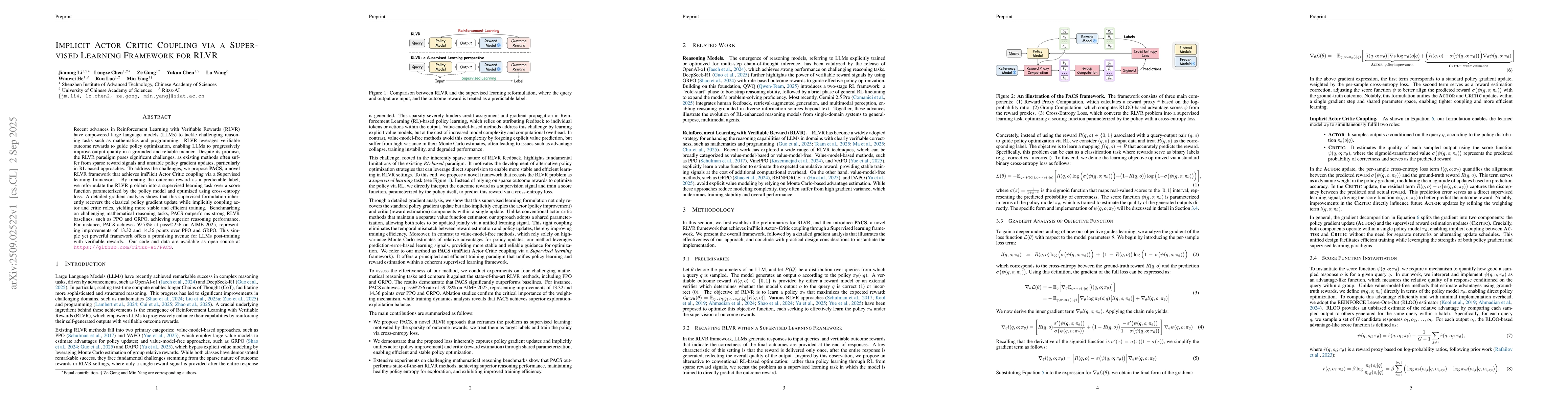 Recent advances in Reinforcement Learning with Verifiable Rewards (RLVR) have empowered large language models (LLMs) to tackle challenging reasoning tasks such as mathematics and programming. RLVR leverages verifiable outcome rewards to guide policy optimization, enabling LLMs to progressively improve output quality in a grounded and reliable manner. Despite its promise, the RLVR paradigm poses significant challenges, as existing methods often suffer from sparse reward signals and unstable policy gradient updates, particularly in RL-based approaches. To address the challenges, we propose $\textbf{PACS}$, a novel RLVR framework that achieves im$\textbf{P}$licit $\textbf{A}$ctor $\textbf{C}$ritic coupling via a $\textbf{S}$upervised learning framework. By treating the outcome reward as a predictable label, we reformulate the RLVR problem into a supervised learning task over a score function parameterized by the policy model and optimized using cross-entropy loss. A detailed gradient analysis shows that this supervised formulation inherently recovers the classical policy gradient update while implicitly coupling actor and critic roles, yielding more stable and efficient training. Benchmarking on challenging mathematical reasoning tasks, PACS outperforms strong RLVR baselines, such as PPO and GRPO, achieving superior reasoning performance. For instance, PACS achieves 59.78\% at pass@256 on AIME 2025, representing improvements of 13.32 and 14.36 points over PPO and GRPO. This simple yet powerful framework offers a promising avenue for LLMs post-training with verifiable rewards. Our code and data are available as open source at https://github.com/ritzz-ai/PACS.