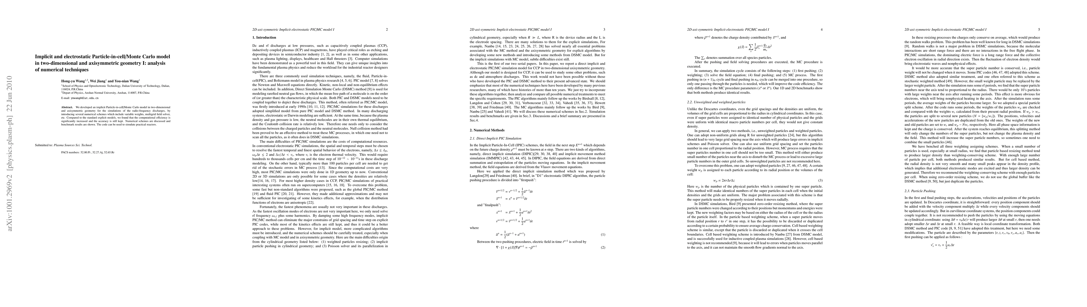 We developed an implicit Particle-in-cell/Monte Carlo model in two-dimensional and axisymmetric geometry for the simulations of the radio-frequency discharges, by introducing several numerical schemes which include variable weights, multigrid field solver, etc. Compared to the standard explicit models, we found that the computational efficiency is significantly increased and the accuracy is still kept. Numerical schemes are discussed and benchmark results are shown. The code can be used to simulate practical reactors.