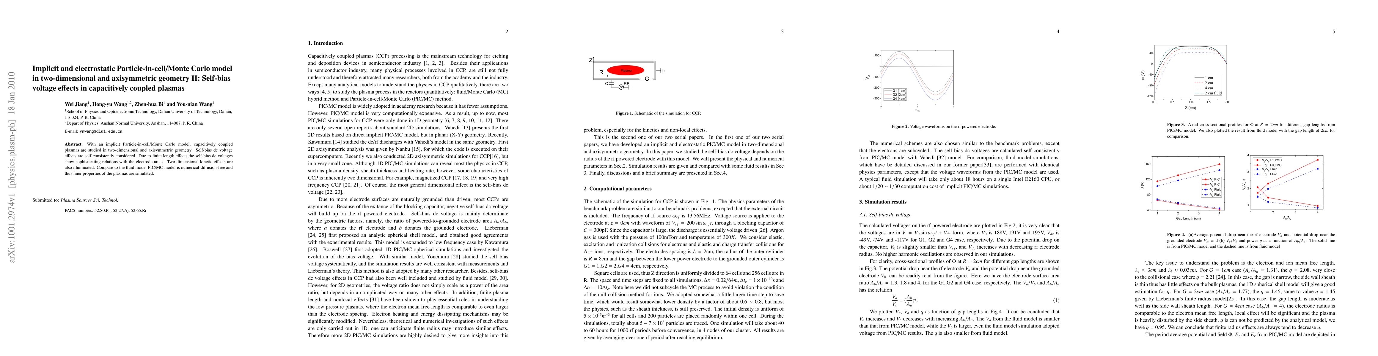 With an implicit Particle-in-cell/Monte Carlo model, capacitively coupled plasmas are studied in two-dimensional and axisymmetric geometry. Self-bias dc voltage effects are self-consistently considered. Due to finite length effects, the self-bias dc voltages show sophisticating relations with the electrode areas. Two-dimensional kinetic effects are also illuminated. Compare to the fluid mode, PIC/MC model is numerical-diffusion-free and thus finer properties of the plasmas are simulated.