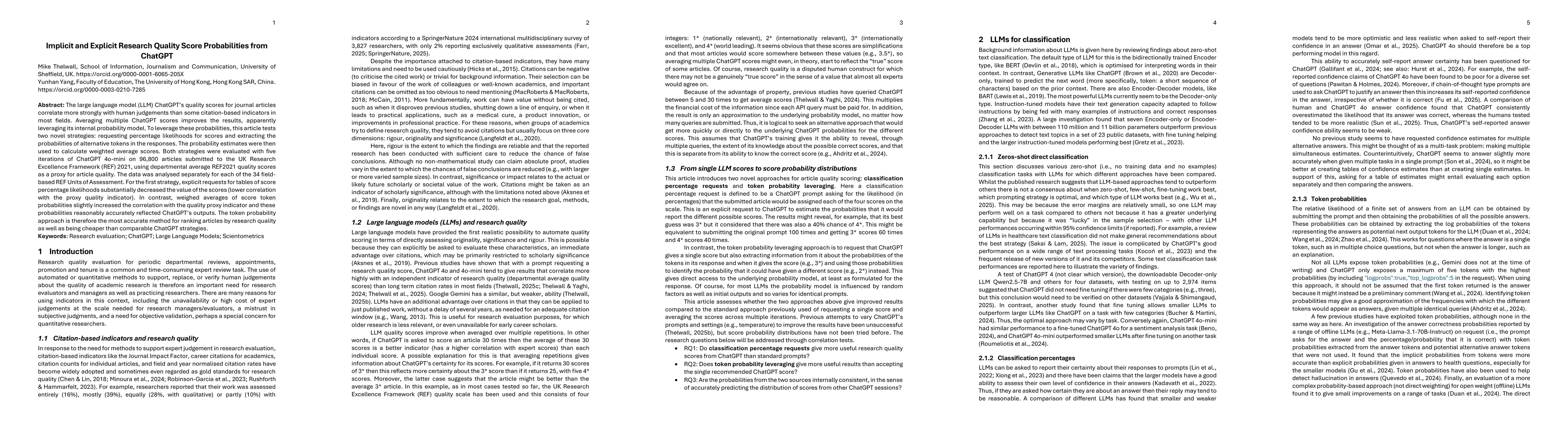 The large language model (LLM) ChatGPT's quality scores for journal articles correlate more strongly with human judgements than some citation-based indicators in most fields. Averaging multiple ChatGPT scores improves the results, apparently leveraging its internal probability model. To leverage these probabilities, this article tests two novel strategies: requesting percentage likelihoods for scores and extracting the probabilities of alternative tokens in the responses. The probability estimates were then used to calculate weighted average scores. Both strategies were evaluated with five iterations of ChatGPT 4o-mini on 96,800 articles submitted to the UK Research Excellence Framework (REF) 2021, using departmental average REF2021 quality scores as a proxy for article quality. The data was analysed separately for each of the 34 field-based REF Units of Assessment. For the first strategy, explicit requests for tables of score percentage likelihoods substantially decreased the value of the scores (lower correlation with the proxy quality indicator). In contrast, weighed averages of score token probabilities slightly increased the correlation with the quality proxy indicator and these probabilities reasonably accurately reflected ChatGPT's outputs. The token probability approach is therefore the most accurate method for ranking articles by research quality as well as being cheaper than comparable ChatGPT strategies.