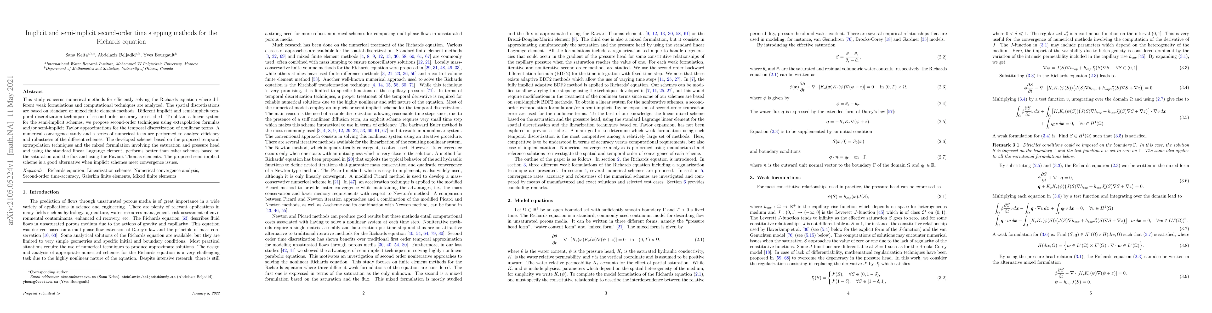 This paper investigates second-order time stepping methods for solving the Richards equation, comparing implicit and semi-implicit techniques. The proposed semi-implicit scheme using temporal extrapolation and mixed finite element methods shows superior performance and robustness over other methods.
