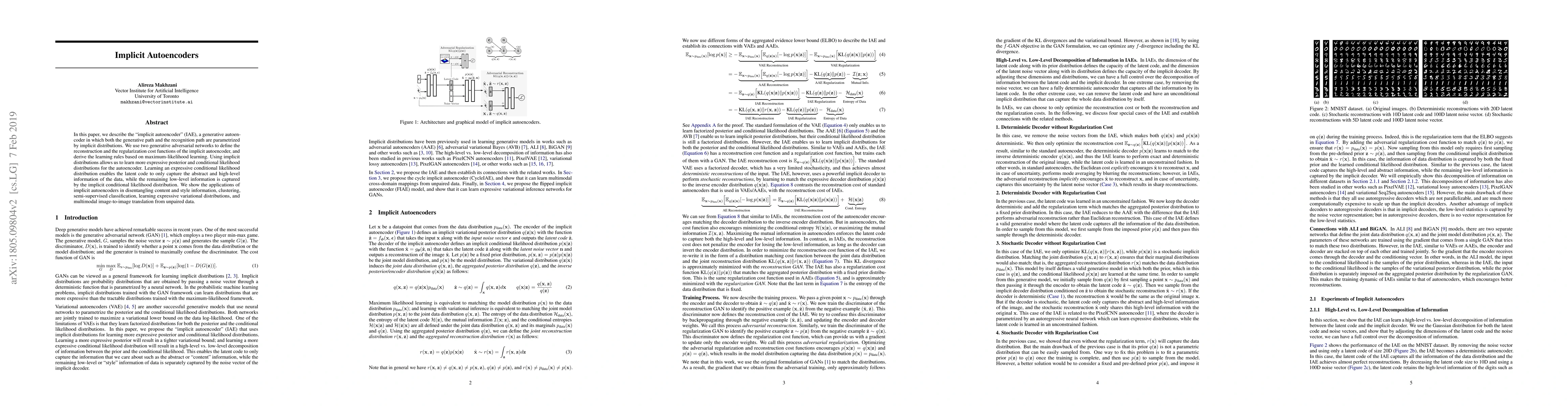 Implicit Autoencoders learn more expressive distributions for autoencoding data, enabling disentanglement of content and style information, clustering, and semi-supervised classification.