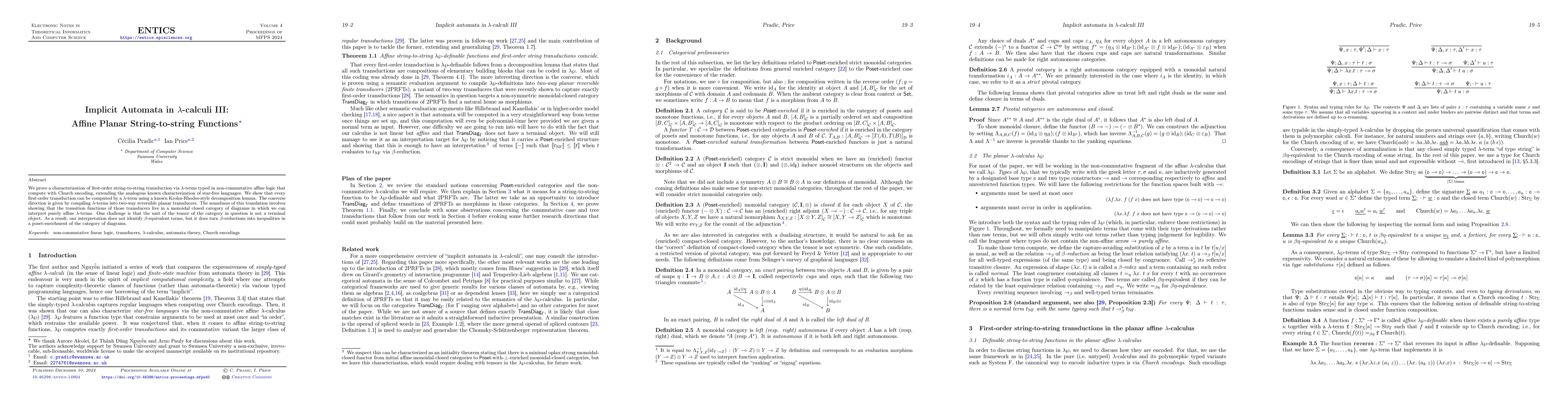 We prove a characterization of first-order string-to-string transduction via $\lambda$-terms typed in non-commutative affine logic that compute with Church encoding, extending the analogous known characterization of star-free languages. We show that every first-order transduction can be computed by a $\lambda$-term using a known Krohn-Rhodes-style decomposition lemma. The converse direction is given by compiling $\lambda$-terms into two-way reversible planar transducers. The soundness of this translation involves showing that the transition functions of those transducers live in a monoidal closed category of diagrams in which we can interpret purely affine $\lambda$-terms. One challenge is that the unit of the tensor of the category in question is not a terminal object. As a result, our interpretation does not identify $\beta$-equivalent terms, but it does turn $\beta$-reductions into inequalities in a poset-enrichment of the category of diagrams.