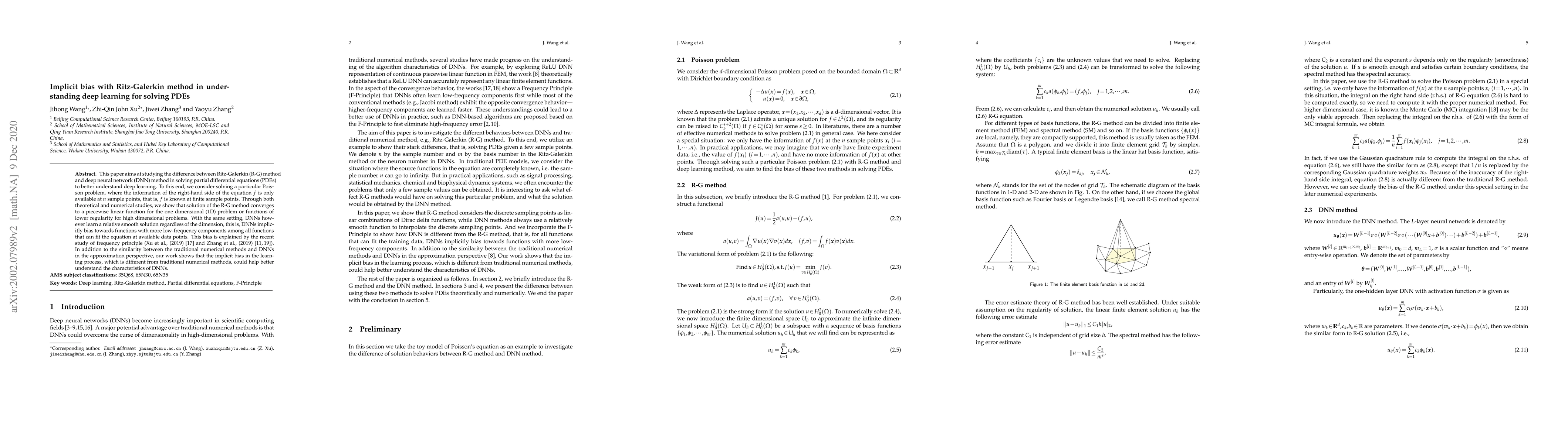 This paper aims at studying the difference between Ritz-Galerkin (R-G) method and deep neural network (DNN) method in solving partial differential equations (PDEs) to better understand deep learning. To this end, we consider solving a particular Poisson problem, where the information of the right-hand side of the equation f is only available at n sample points, that is, f is known at finite sample points. Through both theoretical and numerical studies, we show that solution of the R-G method converges to a piecewise linear function for the one dimensional (1D) problem or functions of lower regularity for high dimensional problems. With the same setting, DNNs however learn a relative smooth solution regardless of the dimension, this is, DNNs implicitly bias towards functions with more low-frequency components among all functions that can fit the equation at available data points. This bias is explained by the recent study of frequency principle (Xu et al., (2019) [17] and Zhang et al., (2019) [11, 19]). In addition to the similarity between the traditional numerical methods and DNNs in the approximation perspective, our work shows that the implicit bias in the learning process, which is different from traditional numerical methods, could help better understand the characteristics of DNNs.